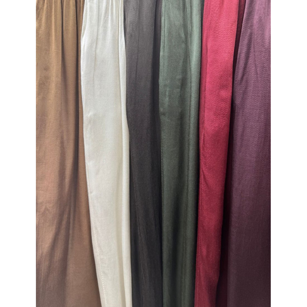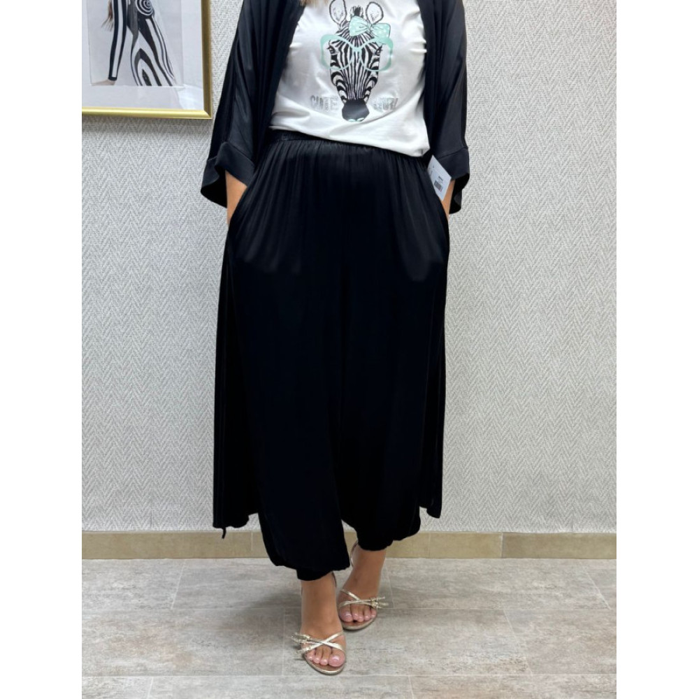 Pantalón largo de satén cogido abajo en tejido de satén con acabado brillante. Presenta cintura elástica y ajuste con puño elástico en el tobillo. Cuenta con bolsillos laterales y caída amplia y fluida.