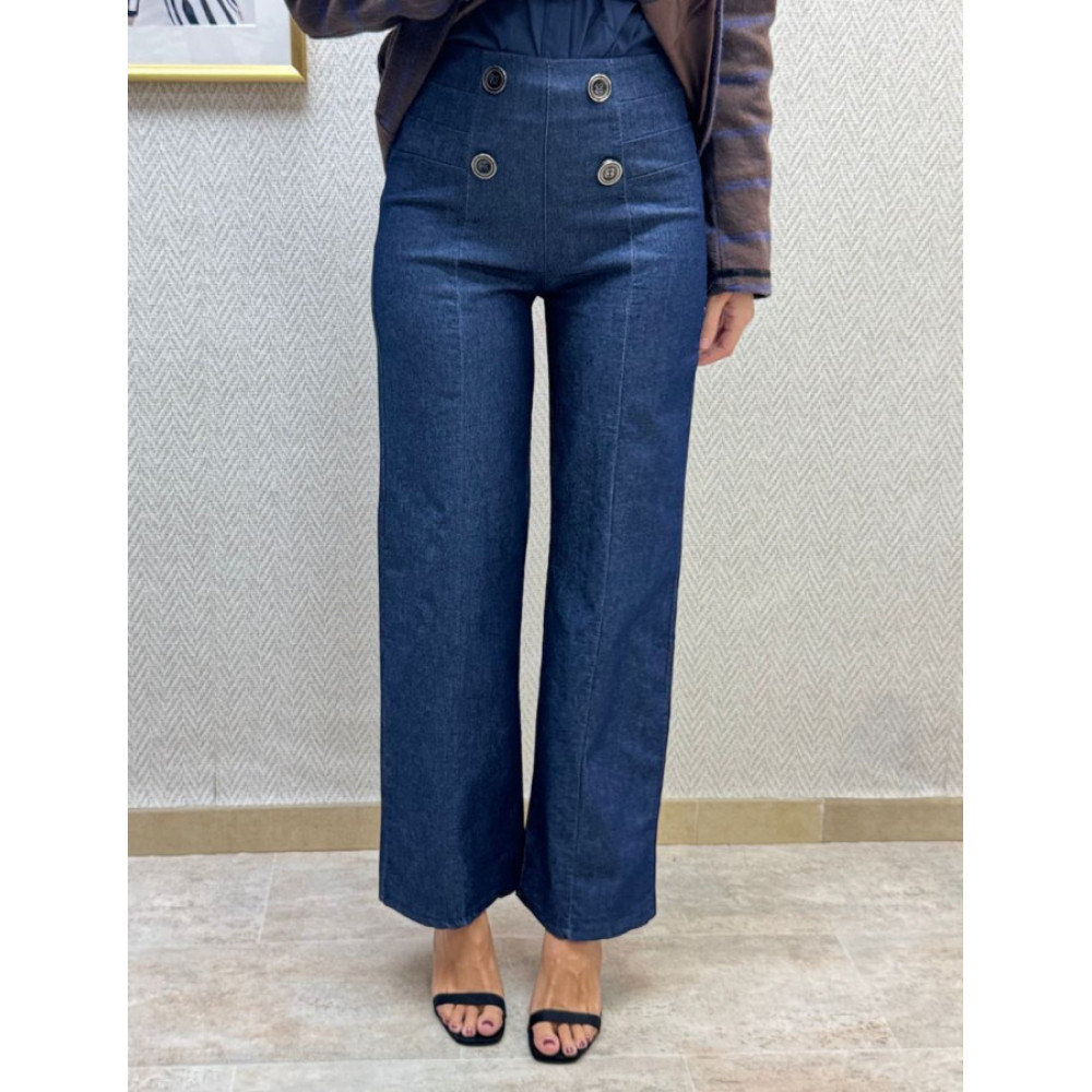 Pantalón vaquero de tiro alto y pierna ancha tipo palazzo en color denim oscuro. Presenta un diseño de inspiración marinera con doble fila de dos botones metálicos grandes en la parte frontal de la cintura. Incorpora costuras verticales marcadas a lo largo de la pierna. Es de tejido denim liso.