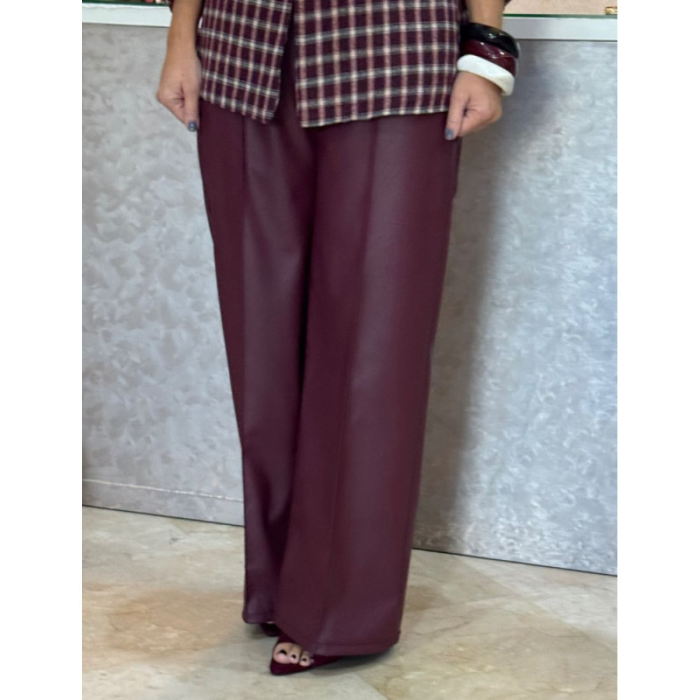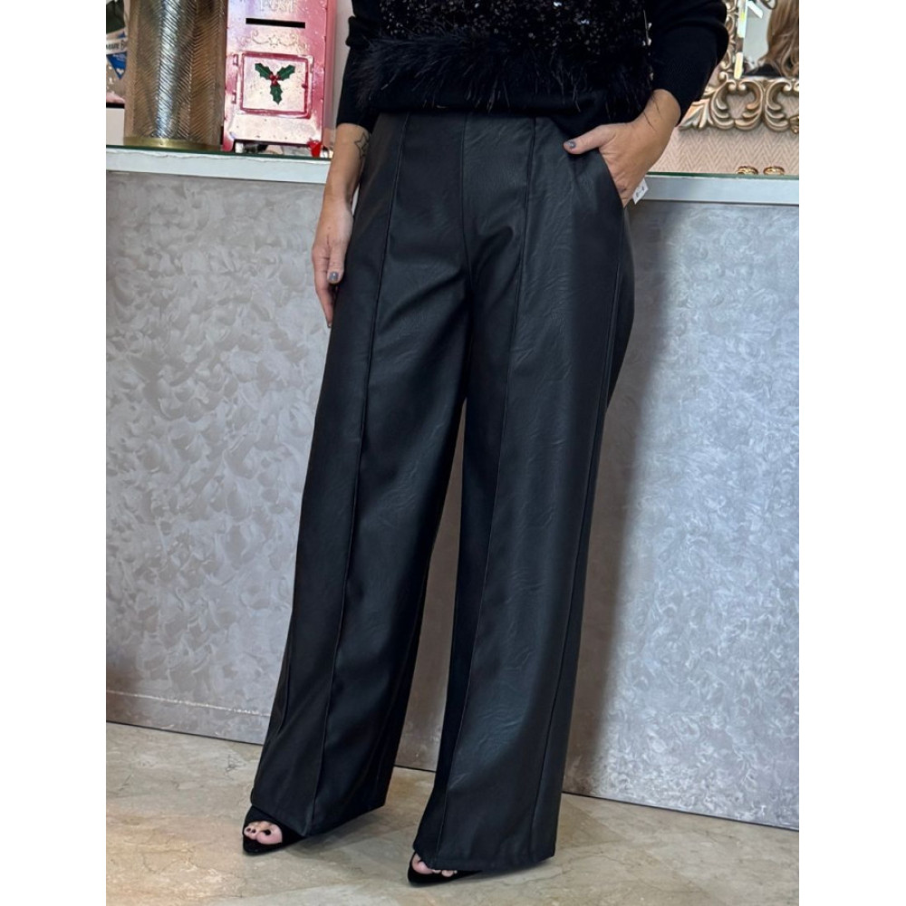 Pantalón de pernera ancha y tiro alto, confeccionado en tejido de polipiel. Presenta un diseño liso con costuras frontales verticales que simulan pliegues permanentes. La cintura tiene trabillas para cinturón, y el cierre es frontal oculto. Incluye cinturón.
