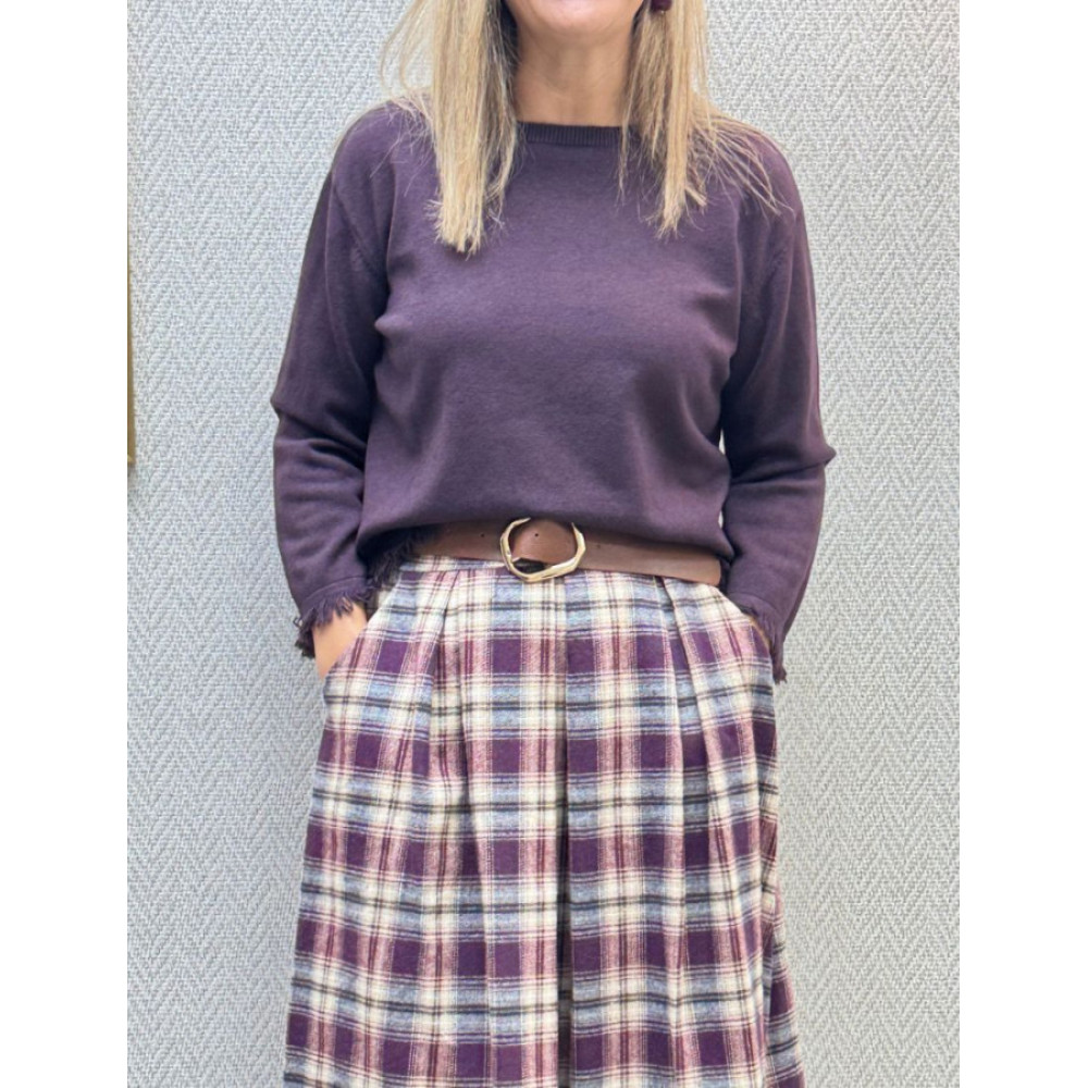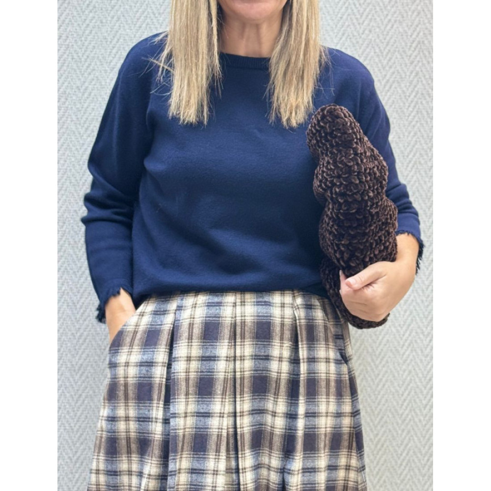 Jersey de punto fino y suave de corte recto. Presenta cuello redondo y manga larga. Los puños están acabados con un detalle de flecos cortos.
