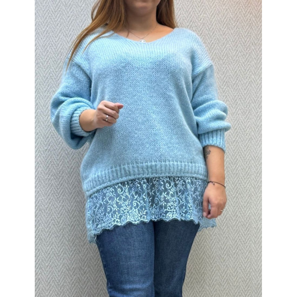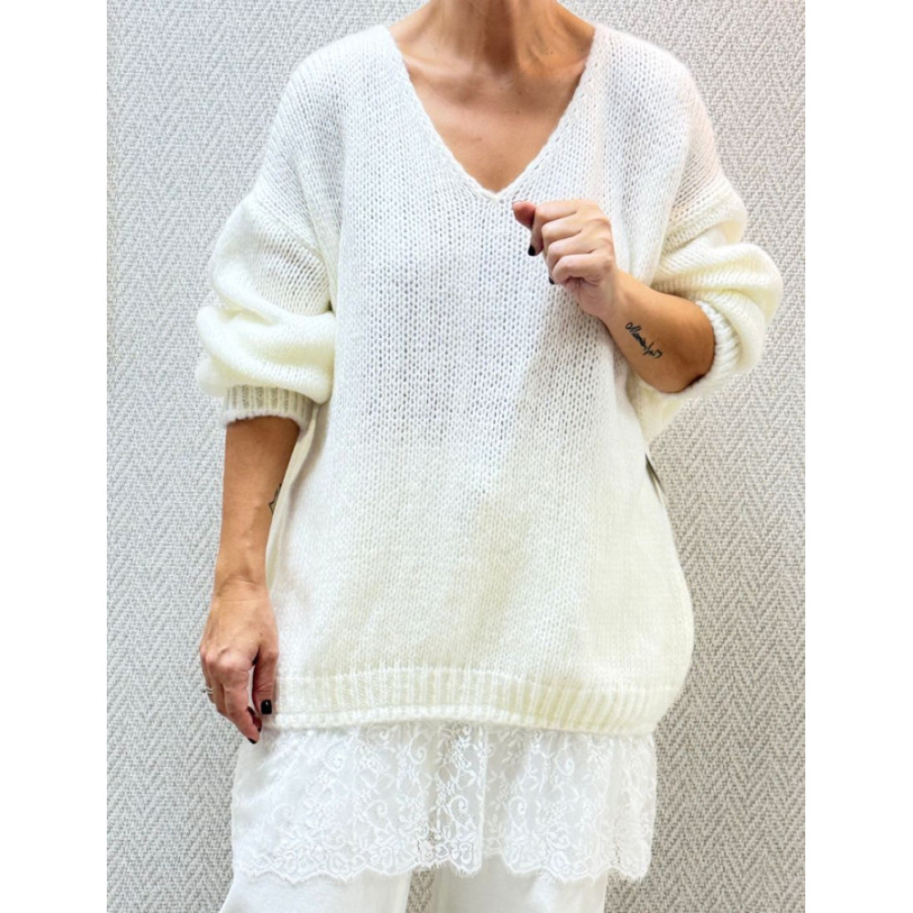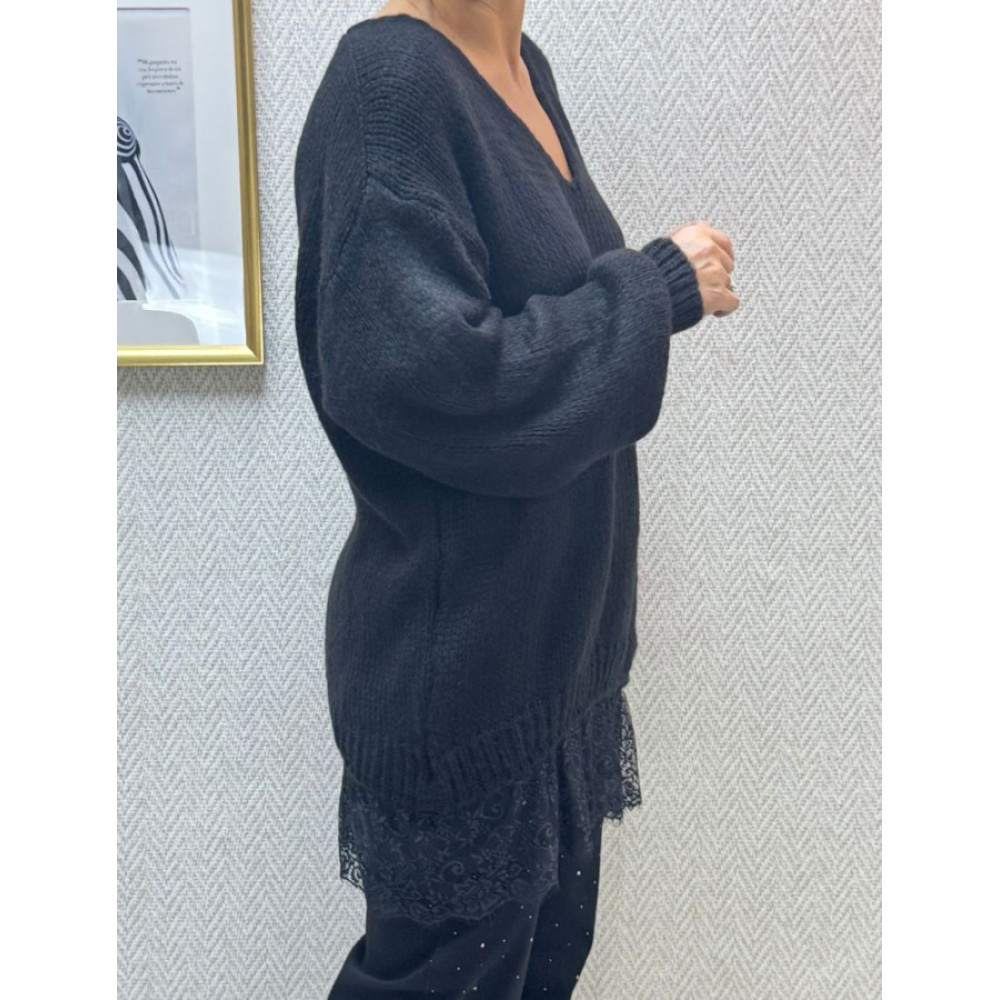 Jersey de punto con escote de pico. Presenta corte oversize y manga larga de corte amplio. El bajo y los puños están rematados con punto de canalé, en la parte inferior, incorpora un volante de encaje que sobresale.
