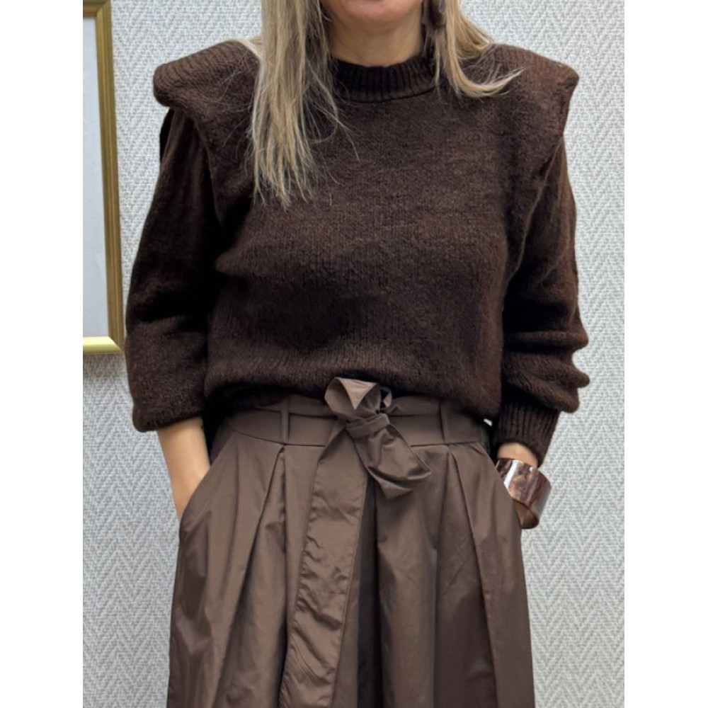 Jersey de silueta holgada. Confeccionado en tejido de punto de lana de apariencia gruesa y peluda. Presenta cuello redondo y manga a tres cuartos, destacando los hombros estructurados con hombreras marcadas.