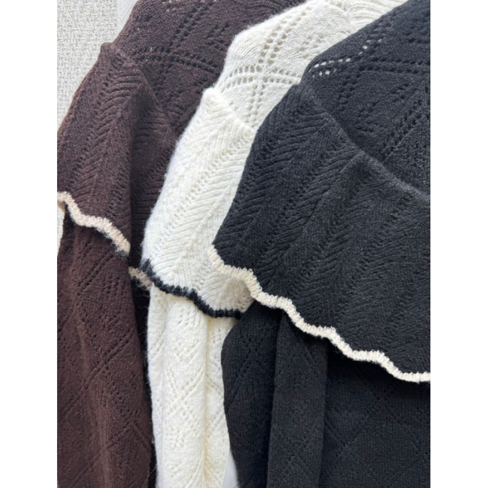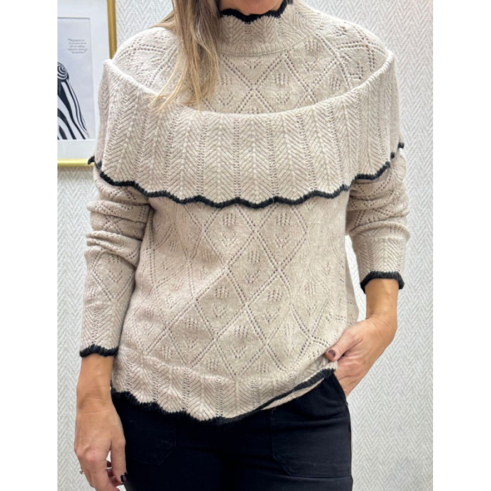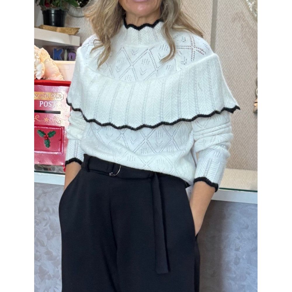 Jersey de punto grueso con patrón calado geométrico. Presenta un cuello alto y un detalle de canesú que simula una caída de hombros. El cuello, los volantes, los puños y el bajo incorporan un ribete de contraste fino.