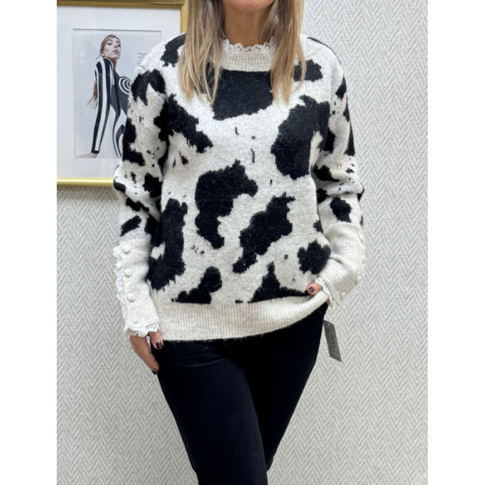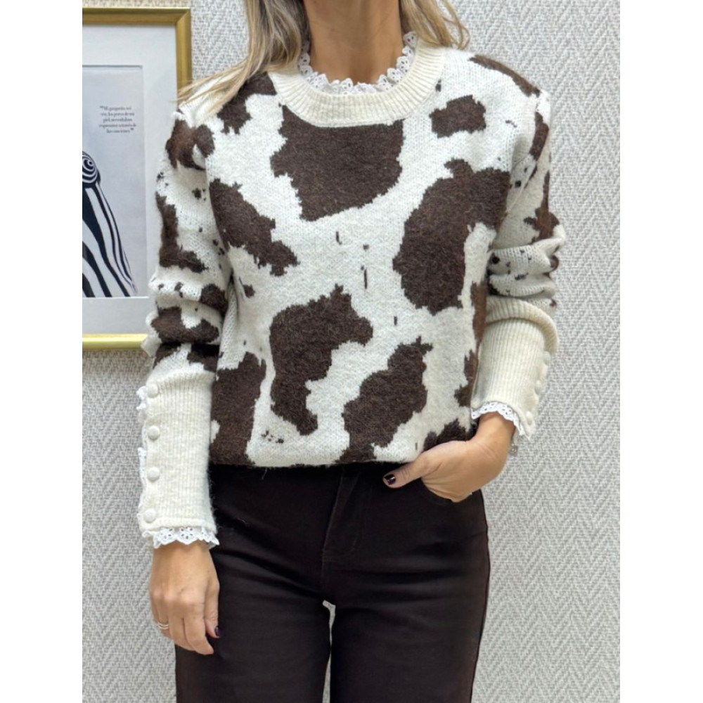 Jersey de punto grueso con estampado de manchas irregulares. Presenta un cuello redondo con remate de volante de encaje festoneado. Las mangas son largas con puños de canalé anchos, rematados con hilera de botones y detalle de encaje festoneado.