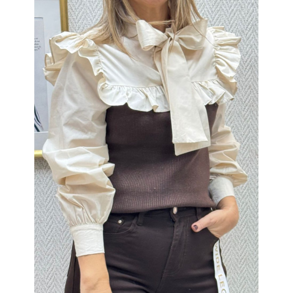 Blusa combinada de corte híbrido. Presenta un cuerpo central de tejido de punto canalé, y el resto confeccionado en tejido de camisa. Cuenta con un cuello alto rematado con una lazada y un volante amplio que cubre los hombros y parte del pecho. La manga es larga y abullonada, ajustada en el puño con cierre de botón.