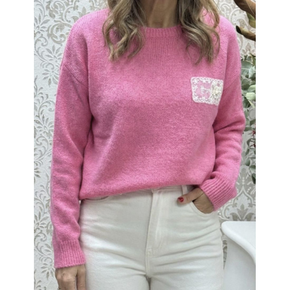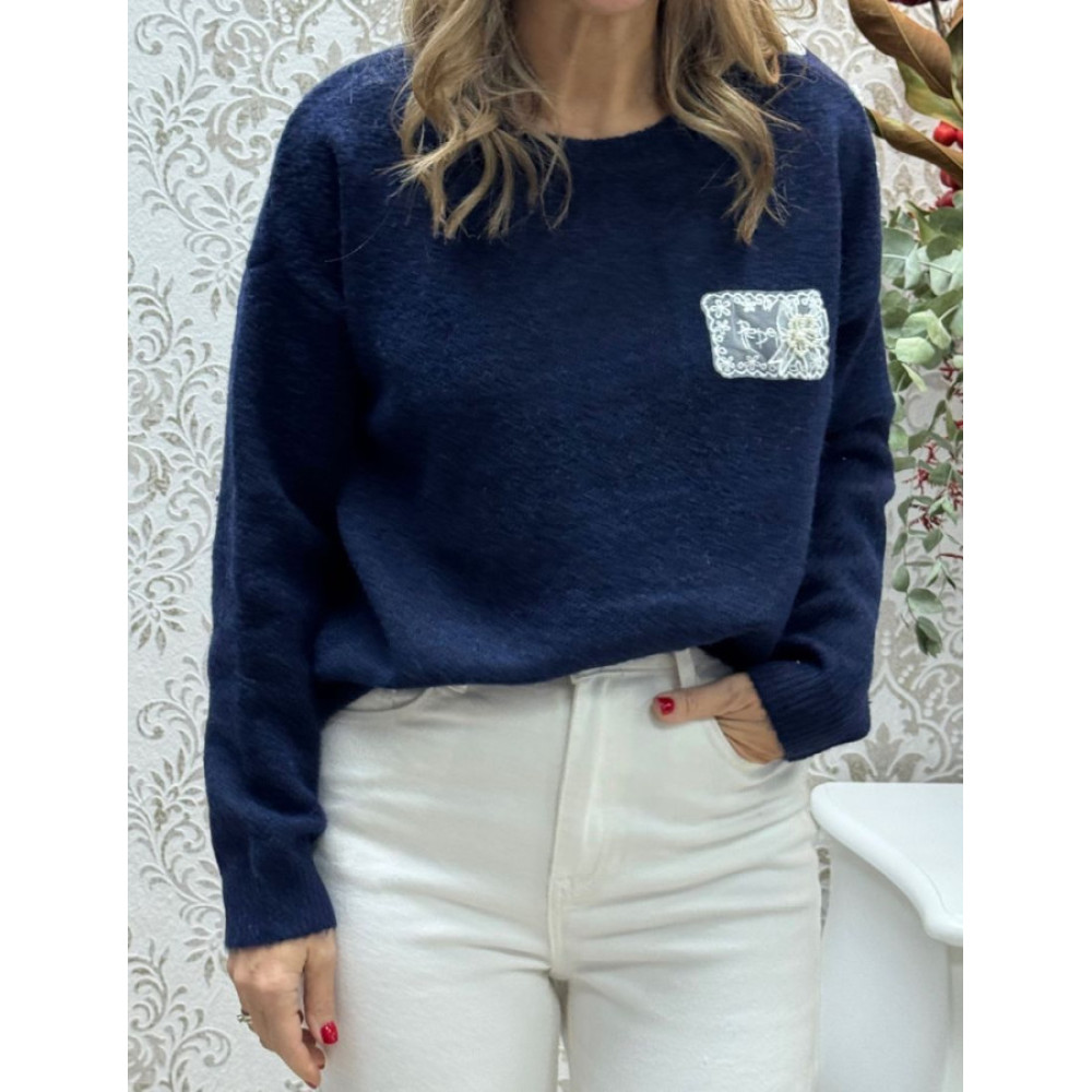 Jersey de punto con cuello redondo de acabado acanalado. La prenda presenta una silueta de corte recto con hombros ligeramente caídos y mangas largas que terminan en puños elásticos de punto de canalé. Dispone de un detalle ornamental en la zona superior izquierda consistente en un aplique de encaje rectangular con bordado floral texturizado y cierre de botones en forma de rosa en el hombro.