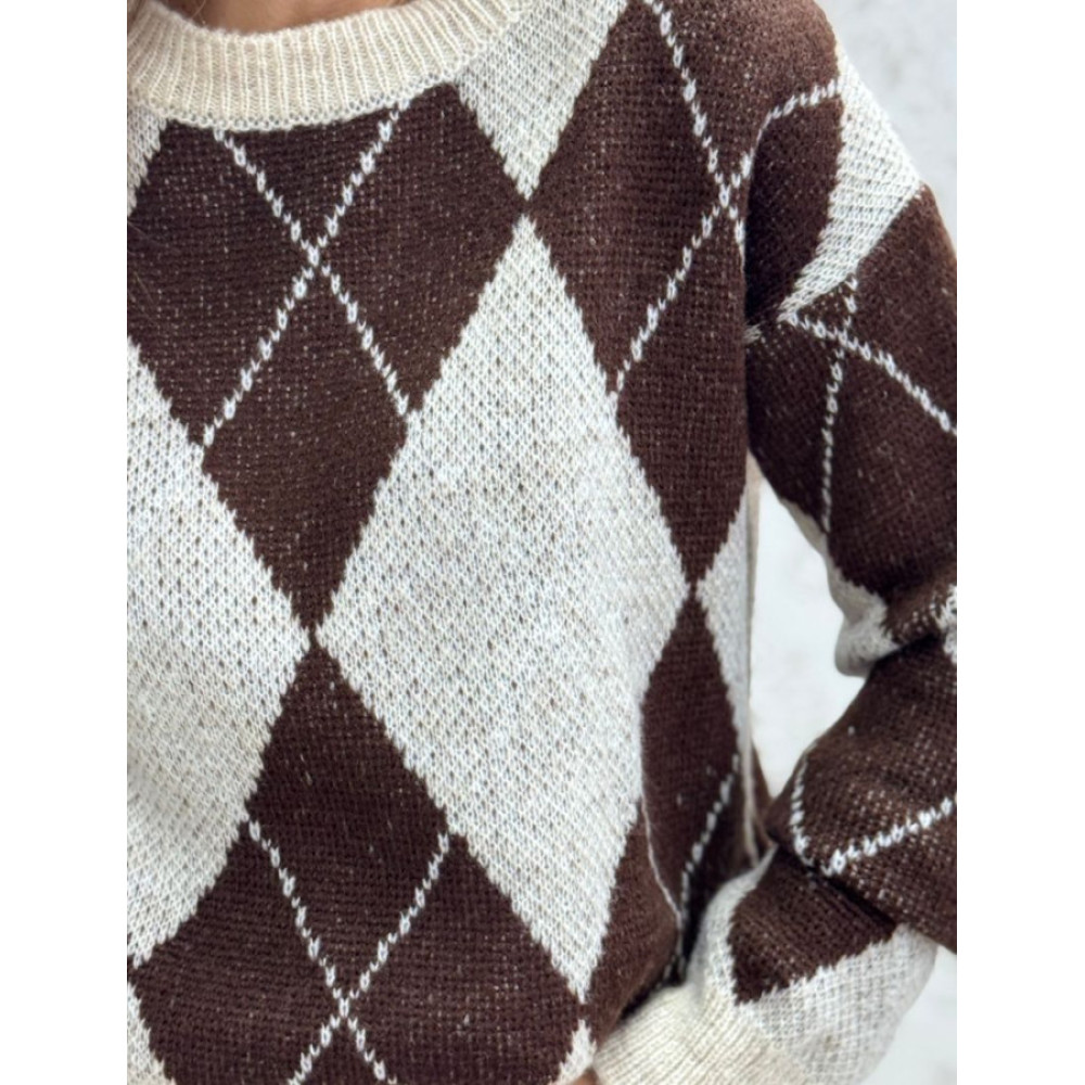 Jersey de punto de grosor medio con patrón geométrico de rombos que se extiende por todo el cuerpo y las mangas. Presenta un diseño de cuello redondo, puños y bajo en punto elástico.