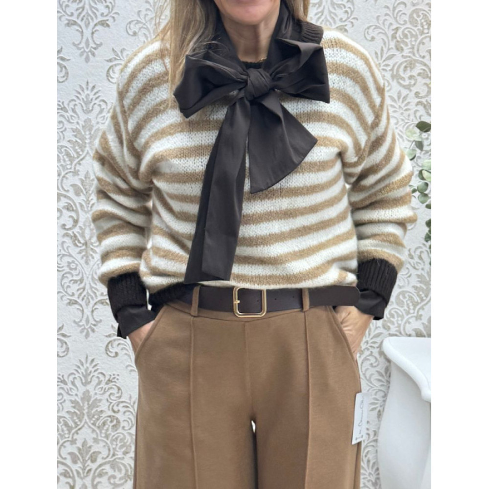Jersey de punto de grosor medio con acabado texturizado y diseño de rayas horizontales. Presenta un corte de manga larga con hombros caídos y remates de canalé elástico en contraste, tanto en los puños como en el cuello redondo. El tejido es ligeramente esponjoso y un ajuste holgado que se adapta a la silueta.