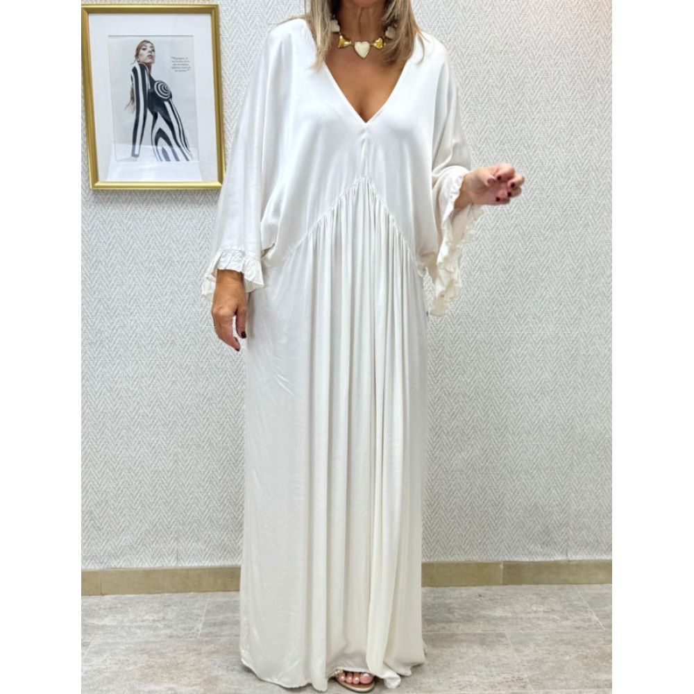 Vestido de satén largo, presenta un escote en pico, manga larga y caída con volantes en los puños. El cuerpo del vestido cuenta con un fruncido en la parte delantera y caída amplia desde debajo del pecho.