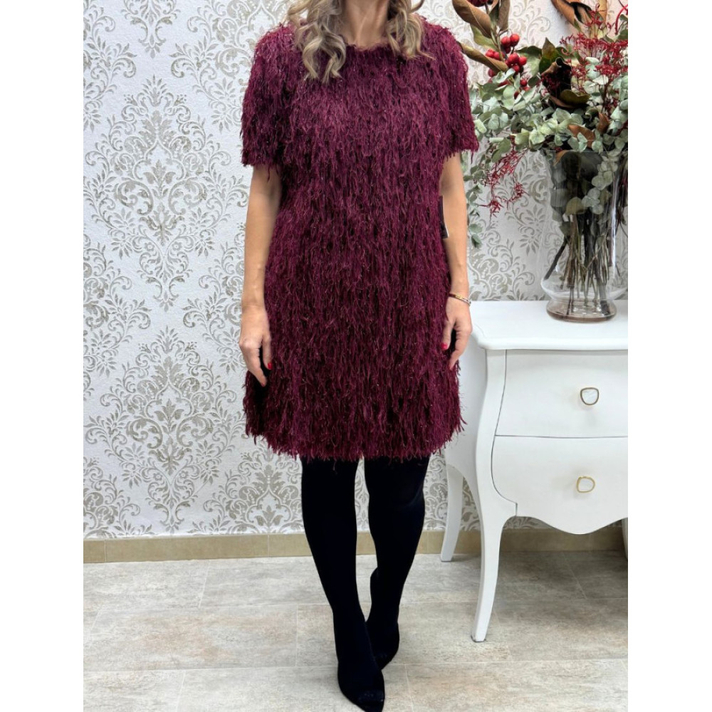 Vestido mini de silueta recta y cuello redondo. Presenta manga corta y está confeccionado íntegramente con un tejido de hilos largos superpuestos que crean una textura voluminosa y un efecto deshilachado.