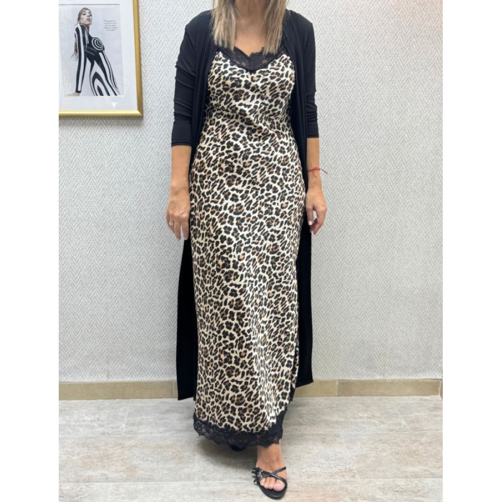Vestido lencero de tirantes finos en tejido de acabado satinado con estampado animal print de leopardo. Presenta escote pico, corte recto entallado. La falda incluye una abertura lateral pronunciada y está rematada con un borde de encaje negro en la abertura y en el bajo