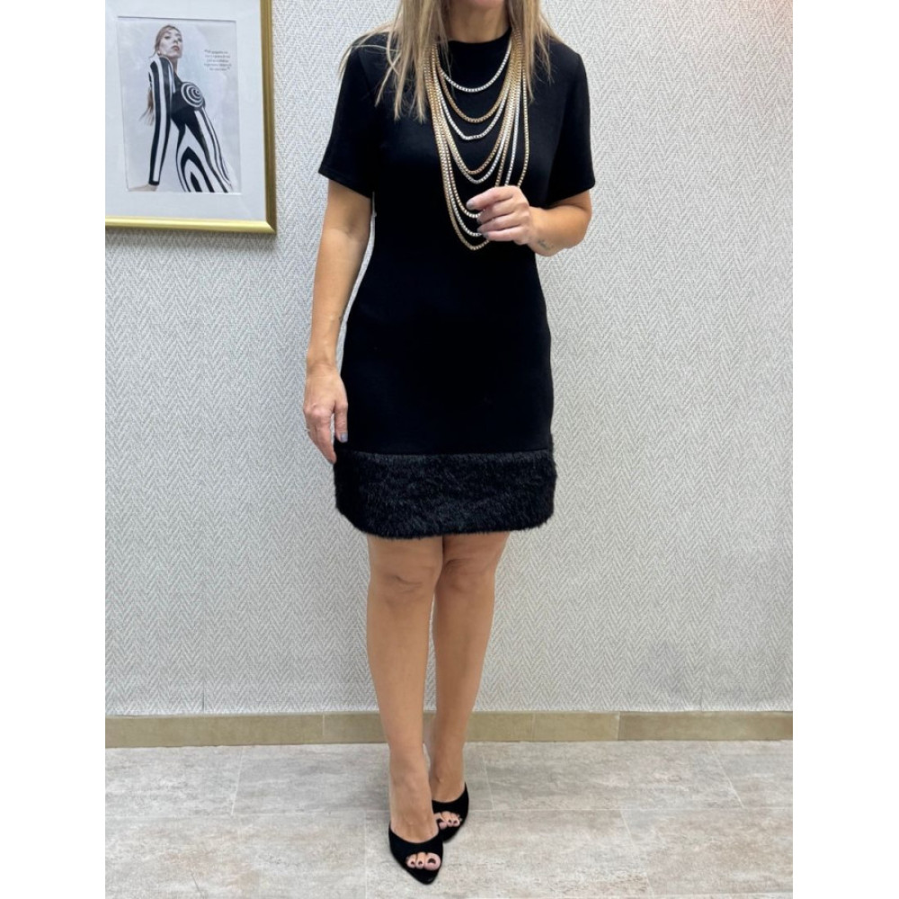 Vestido de corte mini y silueta ajustada. Presenta un cuello alto de estilo chimenea y manga corta. El diseño se caracteriza por un bajo recto rematado con un ribete de pelo sintético de tacto suave.
