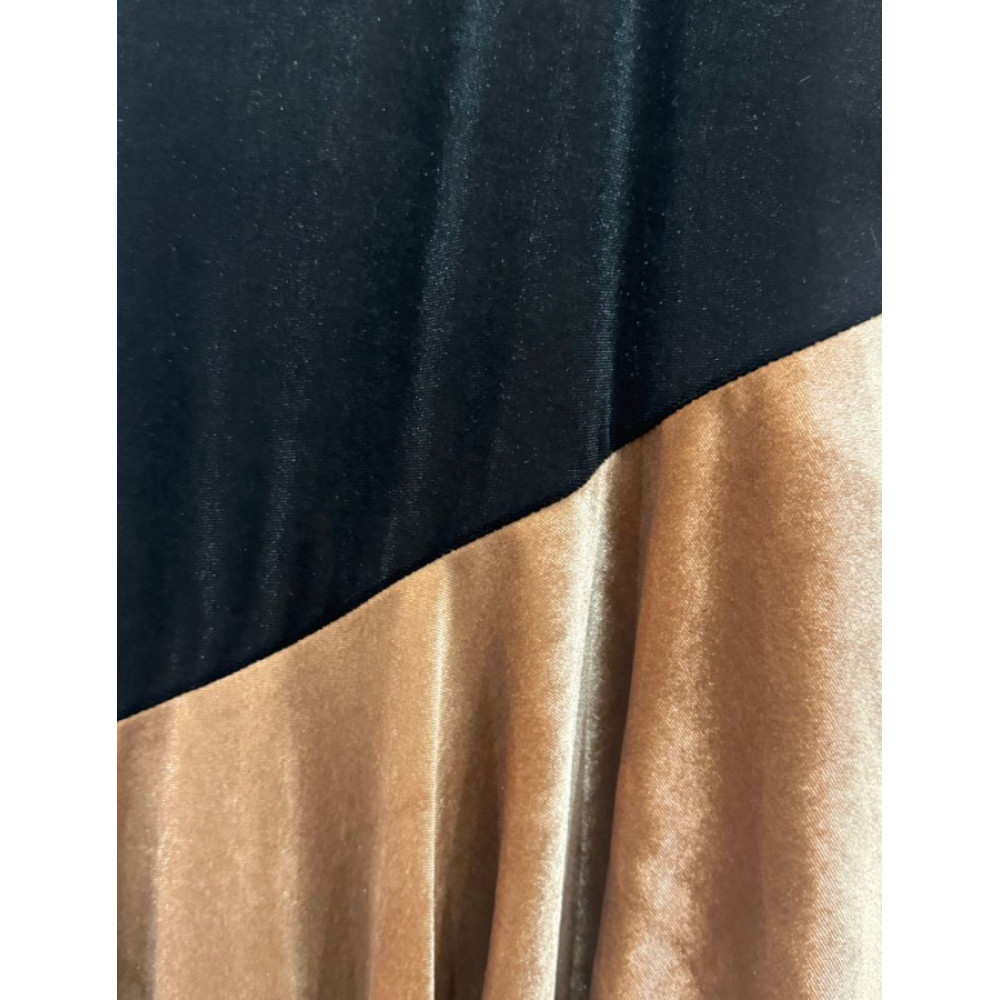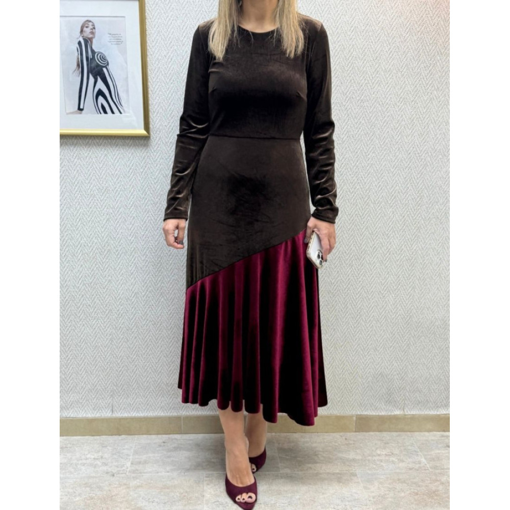 Vestido de largo midi y corte entallado, confeccionado en tejido de terciopelo. Presenta escote redondo y manga larga. Se caracteriza por un corte asimétrico que divide la falda en dos secciones de color. La falda es de corte amplio, con vuelo, y el bajo es recto.