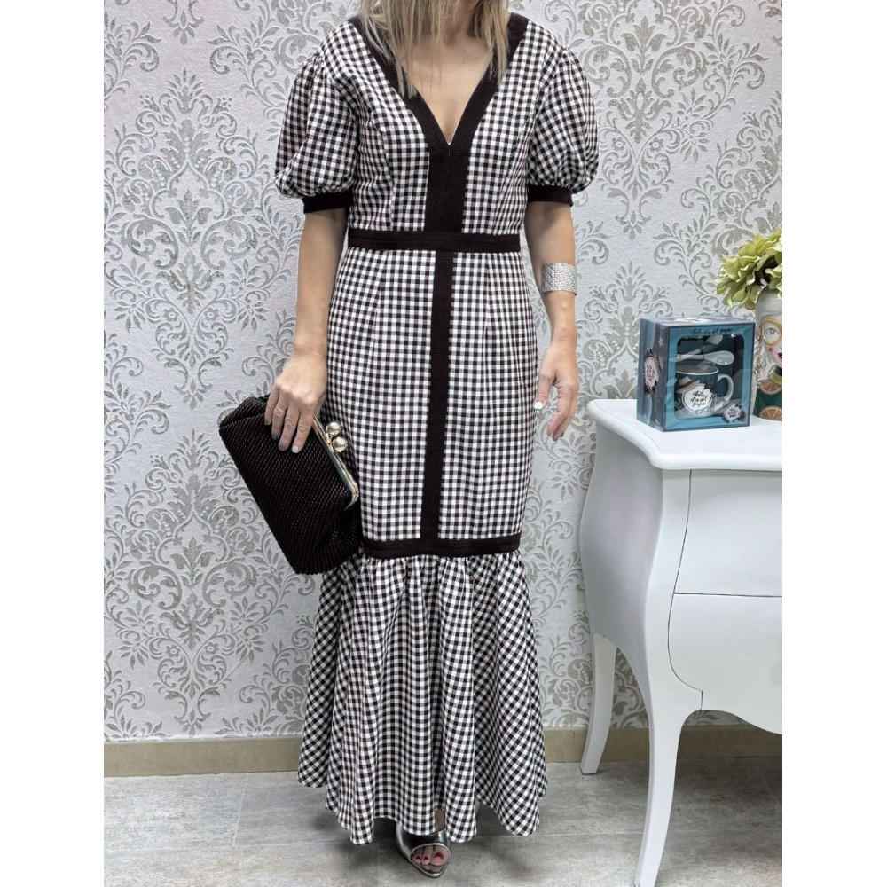 Vestido largo de corte sirena confeccionado en tejido con estampado de cuadros tipo vichy. Presenta un pronunciado escote en "V" y mangas cortas abullonadas con remate de puño elástico en contraste.