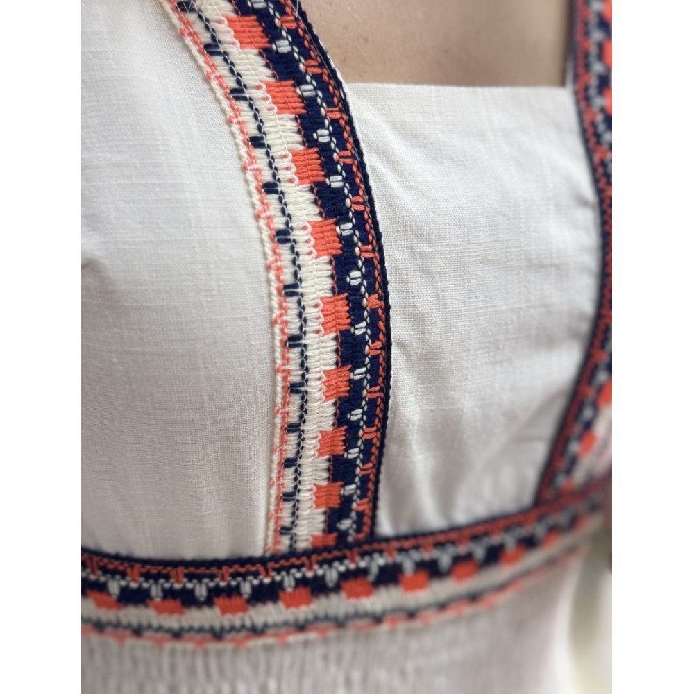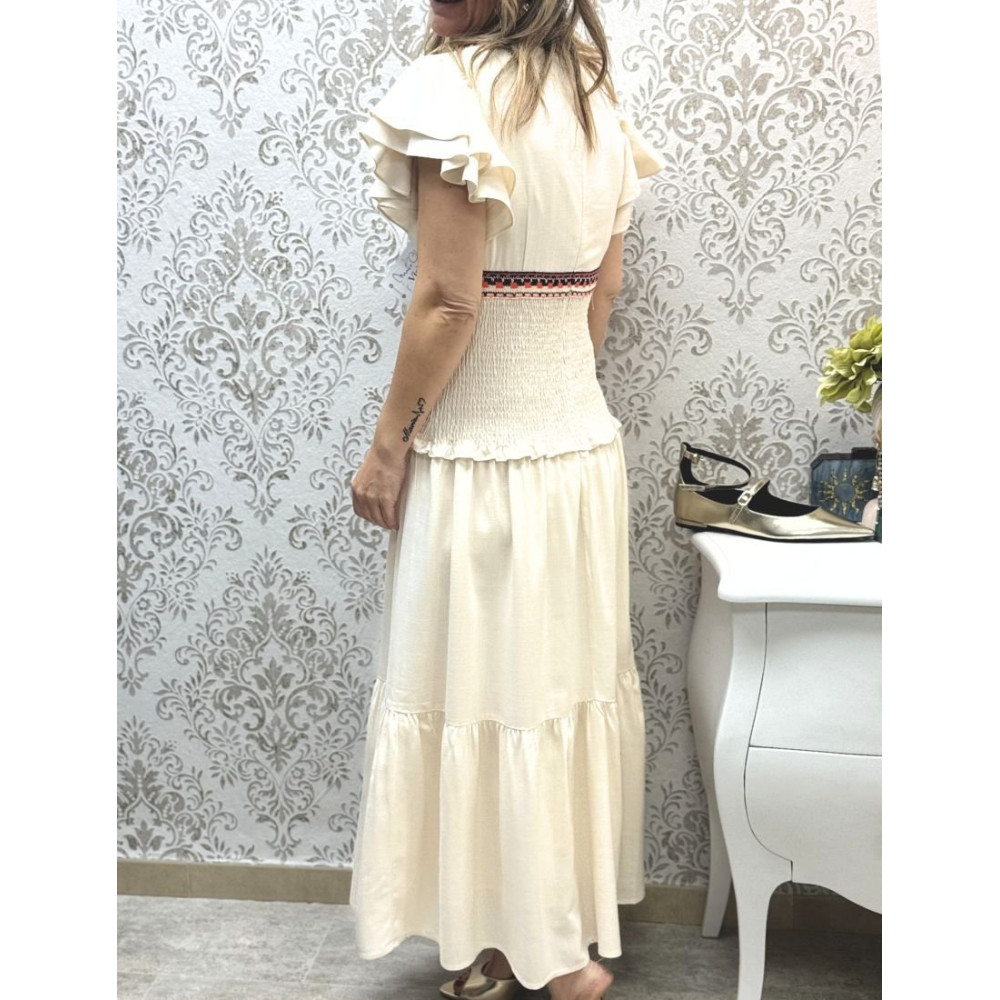 Vestido largo de color crema presenta un cuerpo de corte imperio con un amplio panel de nido de abeja (elástico fruncido) en la zona del talle. Destaca por sus detalles de bordado geométrico en tonos azul marino, naranja y rojo que enmarcan el escote en "V" y la línea de la cintura. Cuenta con mangas cortas de volantes tipo mariposa y una falda fluida dividida en paneles escalonados con ligeros frunces.