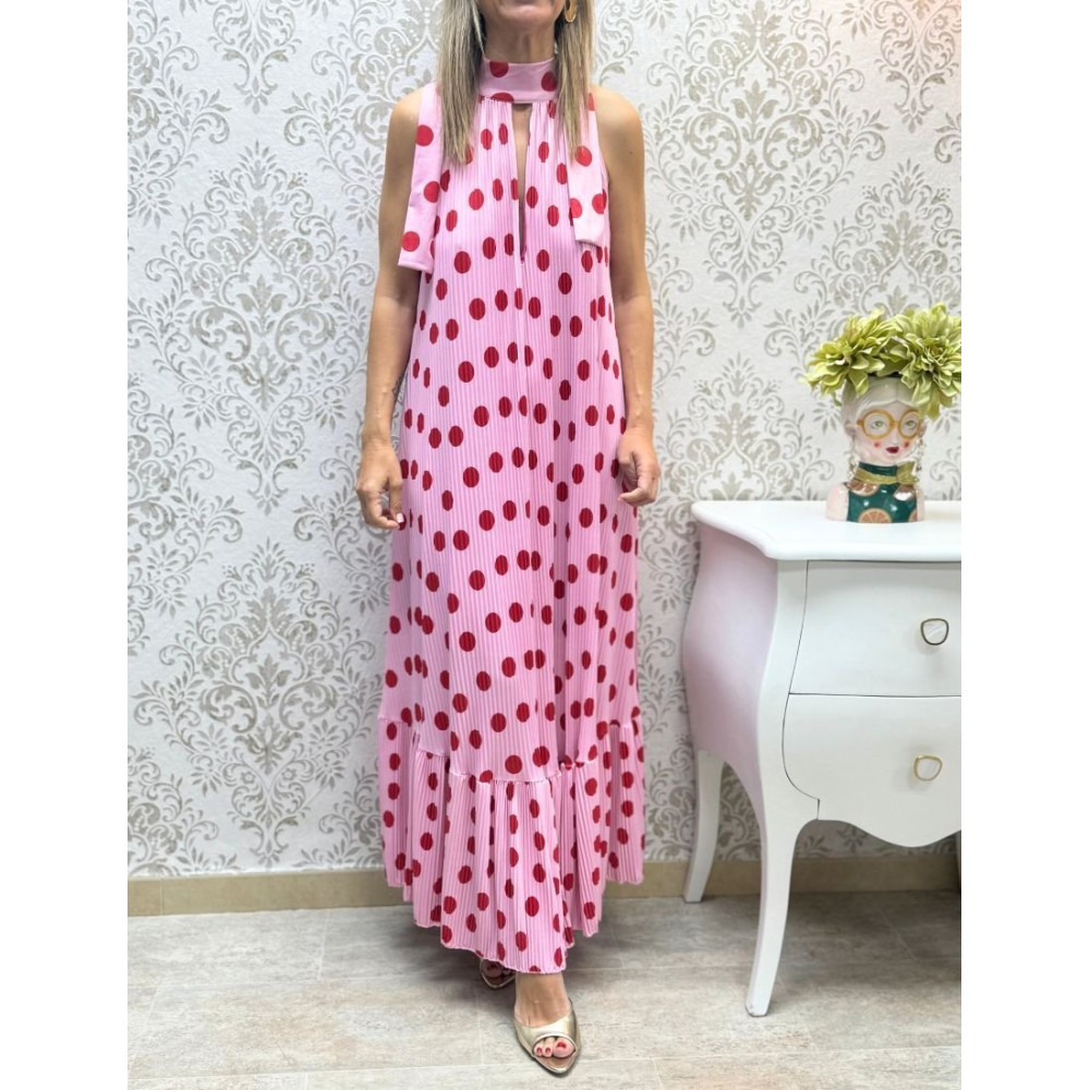 Vestido largo confeccionado en tejido plisado con estampado de lunares en contraste. Presenta un cuello halter con detalle de abertura vertical en el escote y cierre mediante lazada en la parte posterior del cuello. El diseño es de corte fluido con un volante ancho en el bajo y acabado sin mangas.