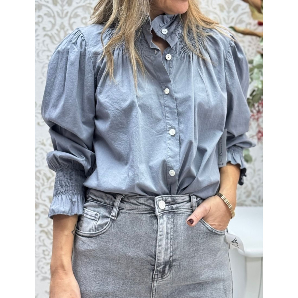 Camisa de tejido liso con cierre frontal abotonado. Presenta un cuello alto con detalle de frunces elásticos y un ligero volante. Las mangas son largas con hombros ligeramente abullonados, terminando en un puño elástico fruncido que crea un efecto de volante en el borde. El cuerpo tiene un corte recto y holgado.