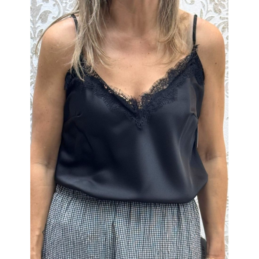 Top lencero de satén negro con escote en pico y ribete de encaje de pestañas a juego. Incorpora finos tirantes ajustables y presenta una caída fluida y relajada.