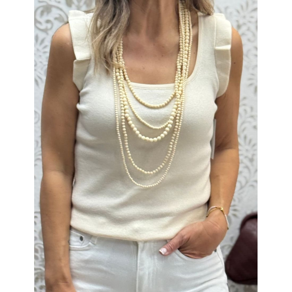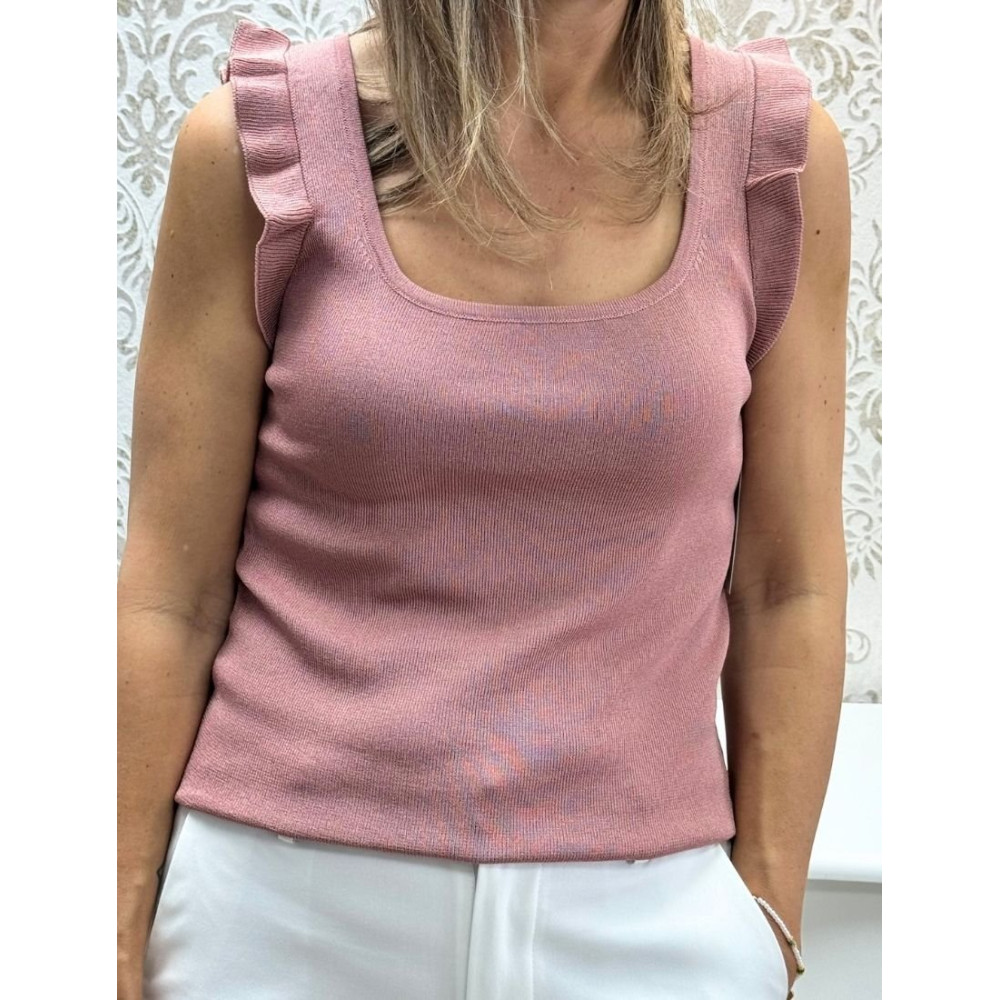Top de punto fino con escote cuadrado y tirantes anchos con volantes fruncidos. Presenta un tejido acanalado y un corte entallado.