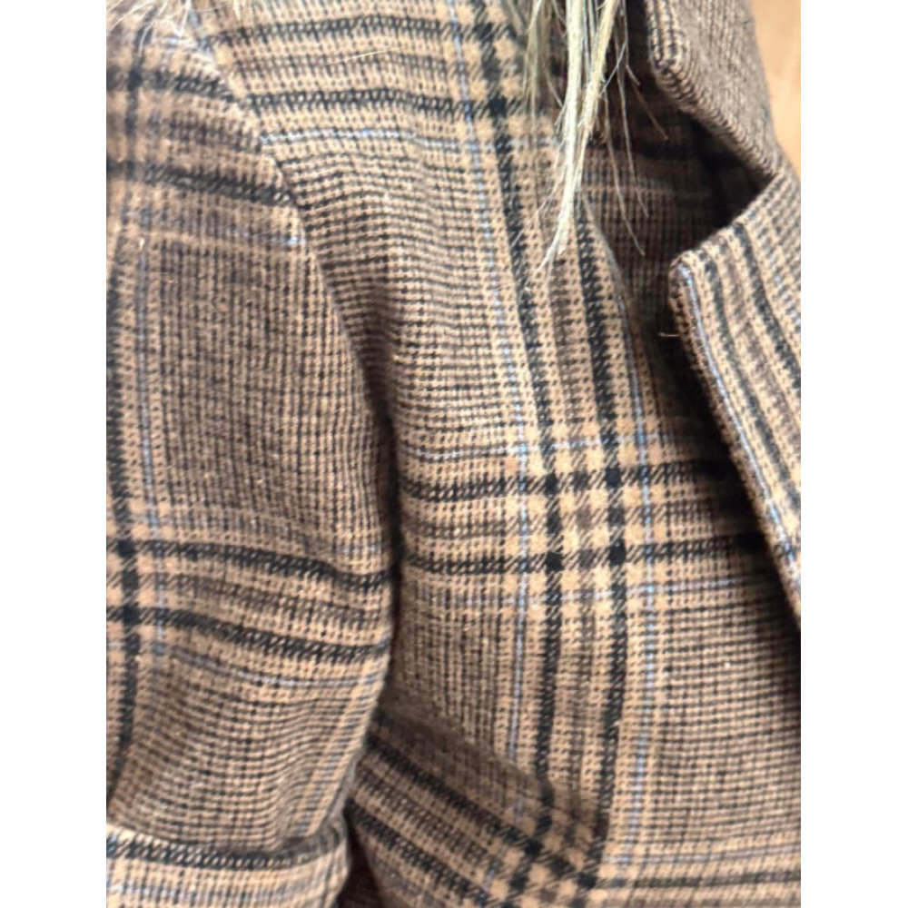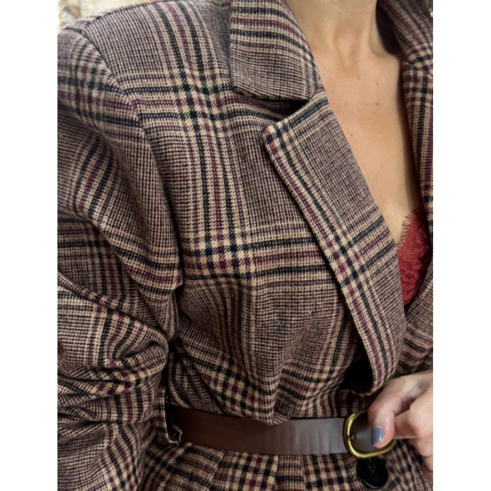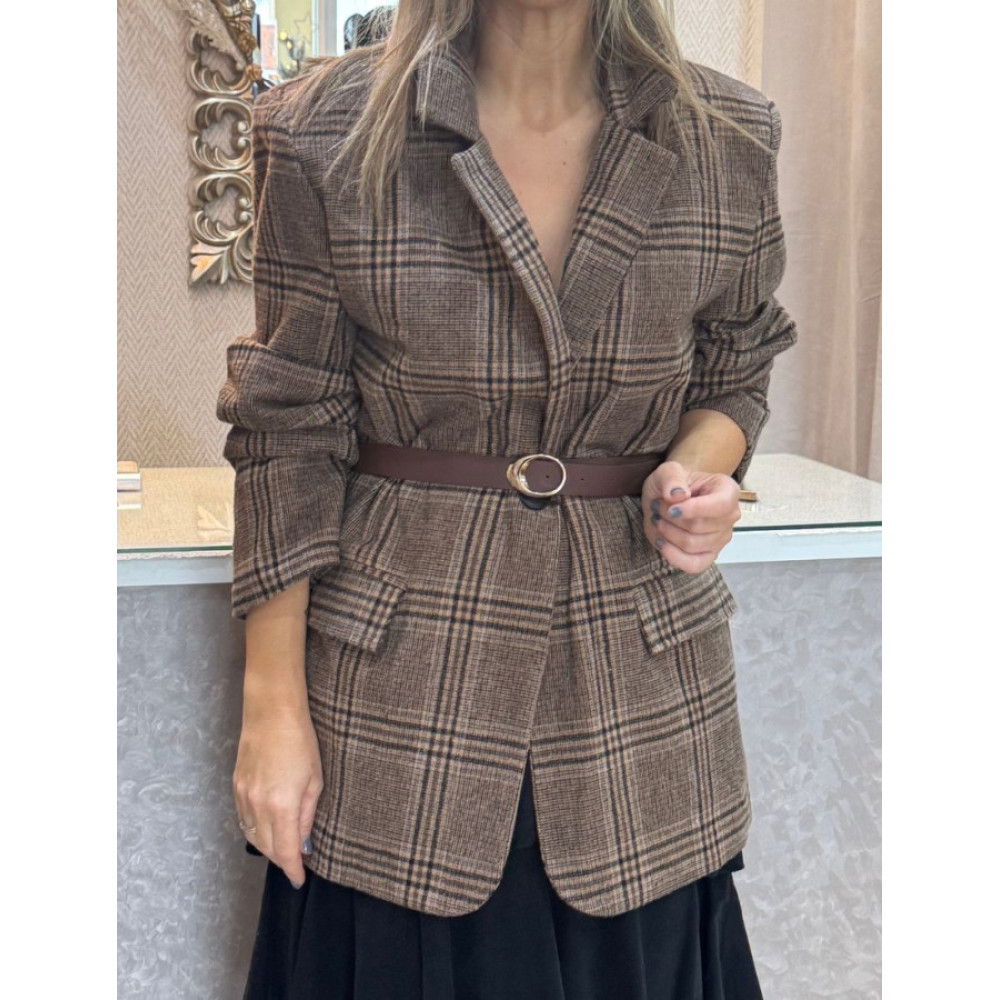 Chaqueta corte largo, confeccionada en tejido de cuadros con una trama de tonos tierra y negro. Presenta un cuello de solapa clásico. La chaqueta es de un solo botón y se ajusta con un cinturón de hebilla redonda en la cintura. Cuenta con bolsillos decorativos de parche con solapa en el delantero. Las mangas son de corte largo.