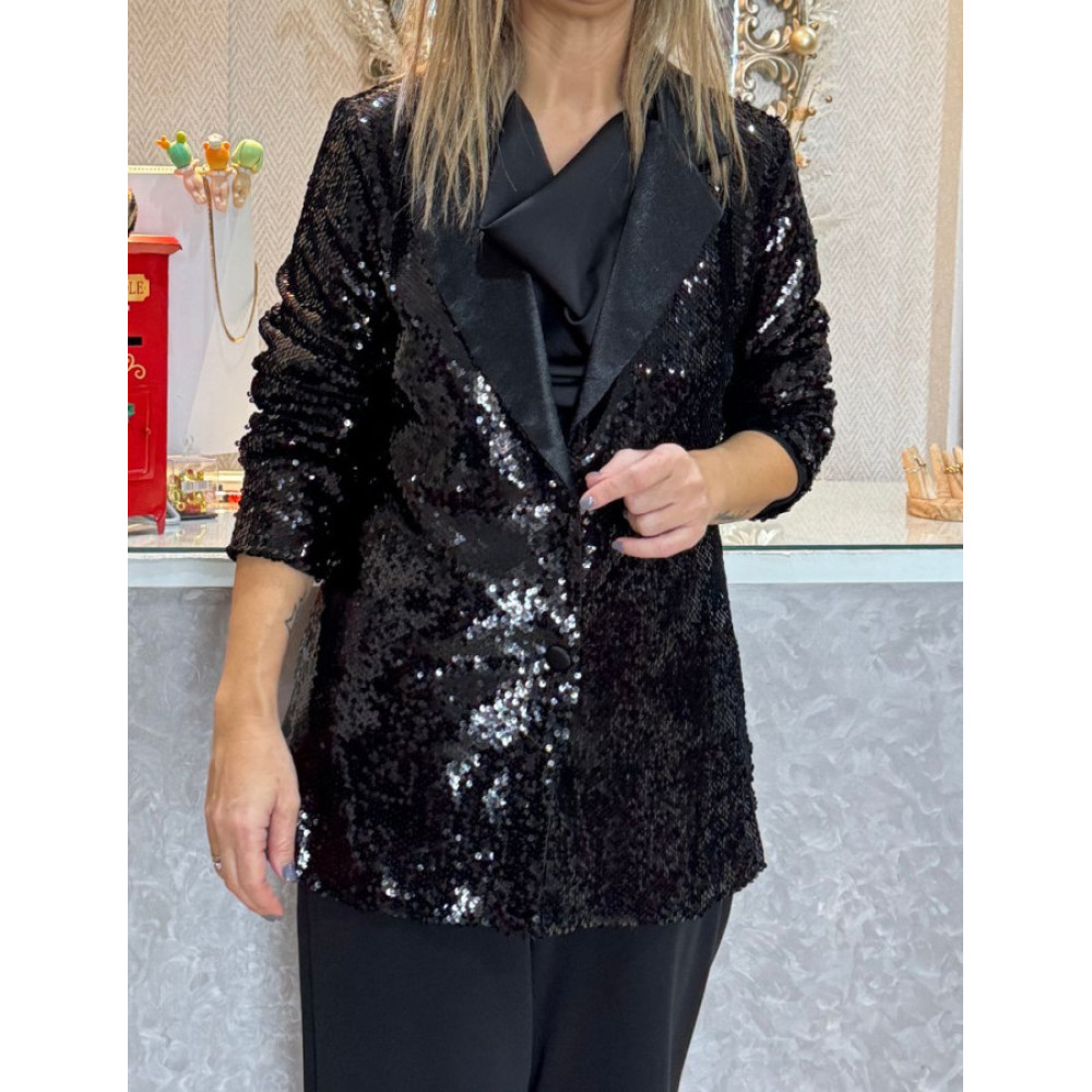 Chaqueta tipo blazer con un corte recto y semi-largo. El tejido principal está completamente cubierto de lentejuelas. Presenta un diseño de cuello smoking con solapas satinadas. El cierre es de un solo botón.