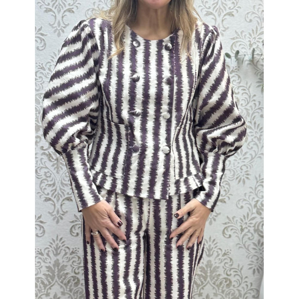 Chaqueta de corte entallado y silueta estructurada confeccionada en tejido con estampado de rayas verticales de efecto ikat en color berenjena y blanco. La prenda presenta un diseño de doble botonadura frontal con botones forrados a juego, cuello redondo sencillo y un bajo con acabado de peplum discreto.