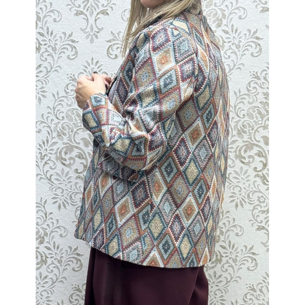 Blazer de manga larga confeccionada en tejido estructurado con textura de tapicería y diseño de jacquard geométrico en forma de rombos. Presenta un cuello de solapa con muesca, cierre frontal mediante un único botón a contraste y dos bolsillos laterales con tapeta. La prenda cuenta con una silueta de corte recto, hombros marcados y costuras interiores reforzadas para mantener la estructura del tejido.