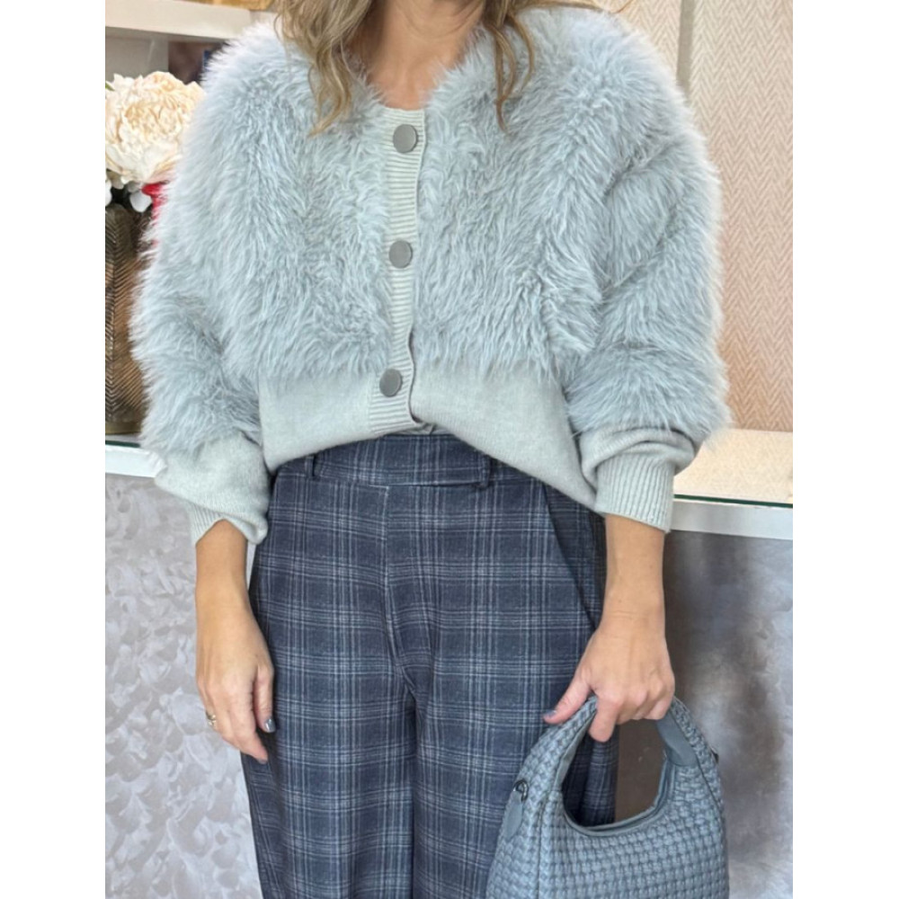 Chaqueta de punto, con silueta recta. Confeccionada en un diseño de dos tejidos: la parte superior delantera y trasera, así como la manga, están cubiertas de pelo sintético de tacto suave, y la parte inferior del cuerpo y el centro delantero son de punto acanalado liso. Presenta cuello redondo, manga larga y cierre central de botones a contraste.