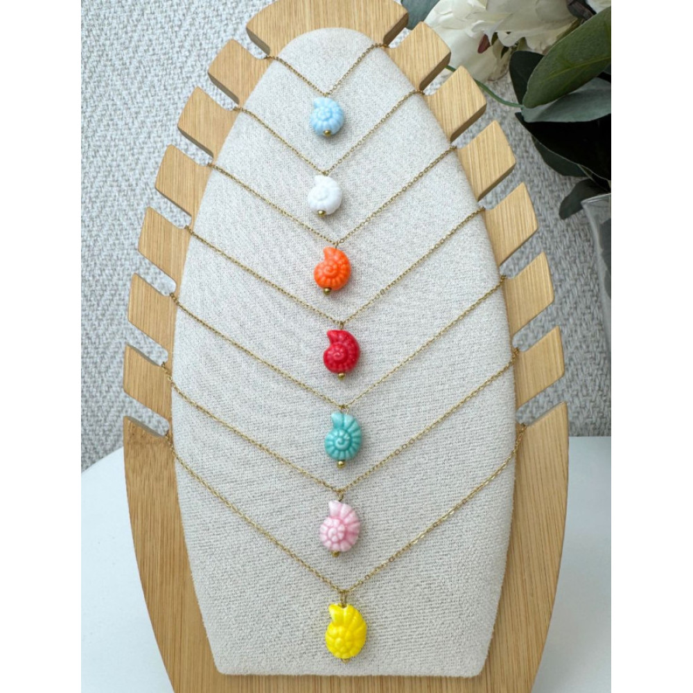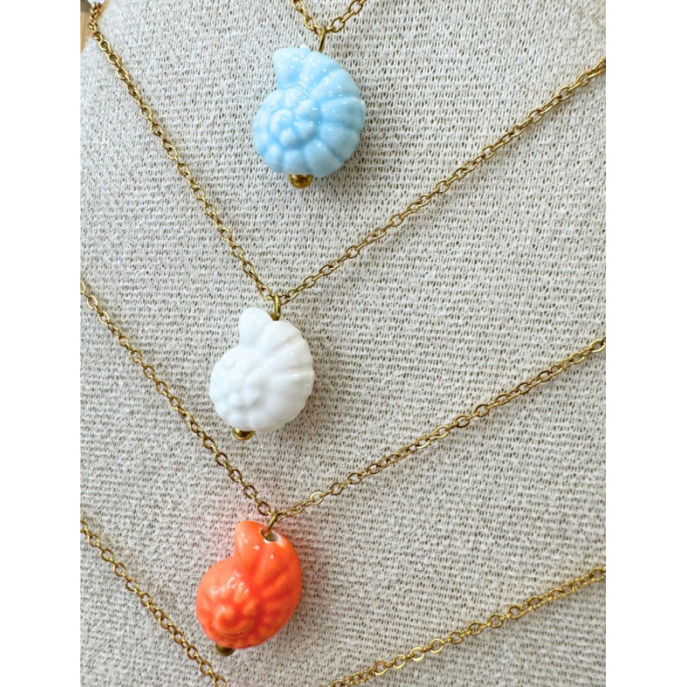 Colgante delicado con cadena de acero inoxidable dorado y un dije en forma de caracola de cerámica, disponible en una variedad de colores vivos. Ideal para un estilo veraniego y casual.