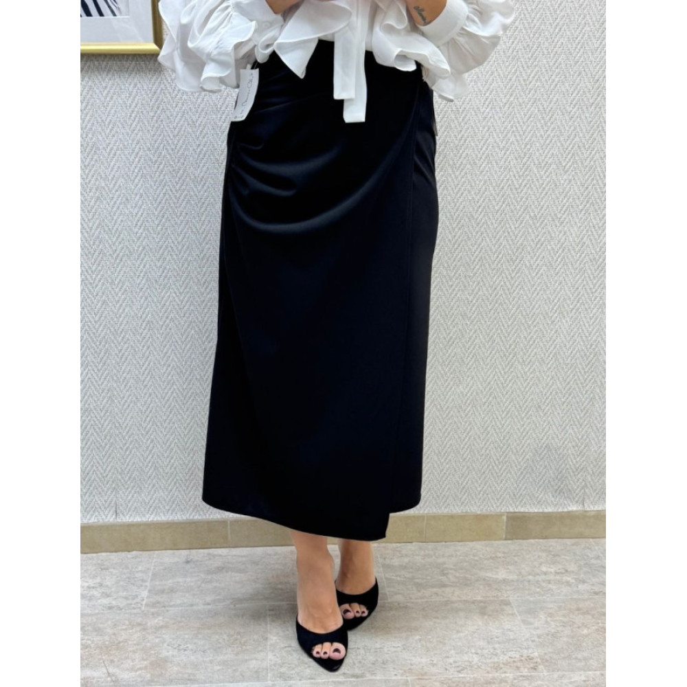 Falda midi. Presenta cintura de tiro medio. El diseño cuenta con un nudo drapeado en la cintura, creando una apertura frontal. La cintura tiene un detalle de anilla circular dorada.