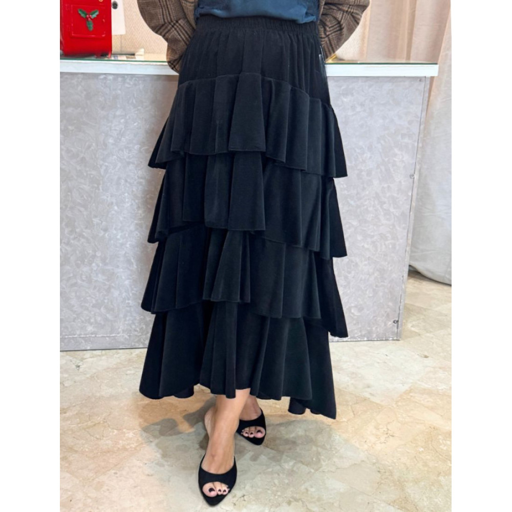 Falda larga con múltiples volantes superpuestos. Presenta un corte de tiro alto con una caída fluida que genera volumen. El tejido es pana fina o velvetón de textura suave.