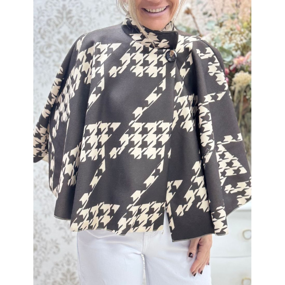 Poncho corto con estampado. Presenta cuello alto con un cierre de botón lateral. El corte es amplio y acampanado, con mangas tres cuartos anchas. El tejido es estructurado, y el cinturón fino de piel en color marrón está incluido con la prenda.