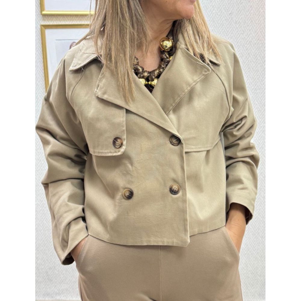 Gabardina de largo cropped por encima de la cintura. Presenta cuello de solapa y cierre frontal cruzado de doble botonadura con cuatro botones grandes. Diseñada con manga larga y ancha con costura de hombro caída.