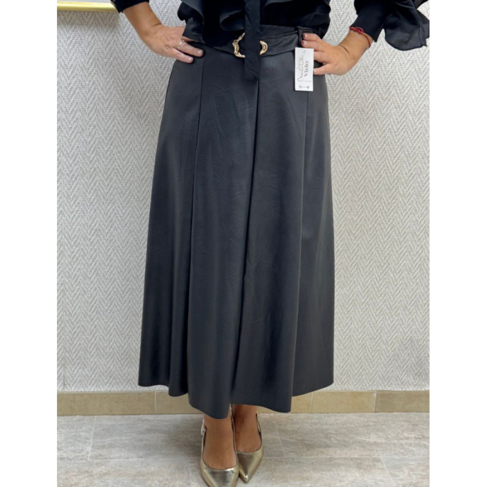Falda midi de corte en línea A en tejido de polipiel o cuero sintético de color negro. Presenta tiro alto, cintura lisa con trabilla ancha y un cinturón fino con hebilla metálica decorativa. El tejido tiene una caída fluida y un acabado mate.