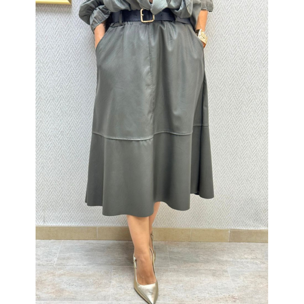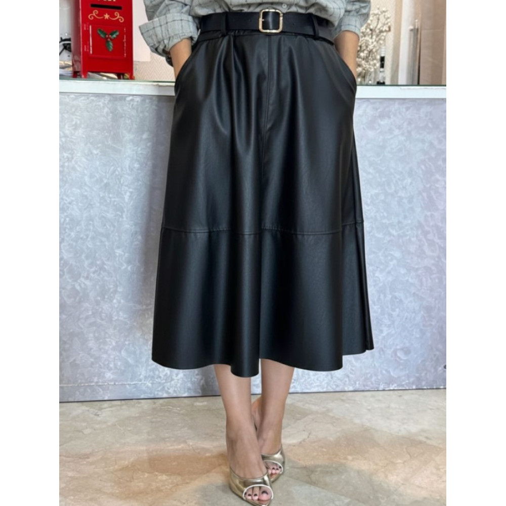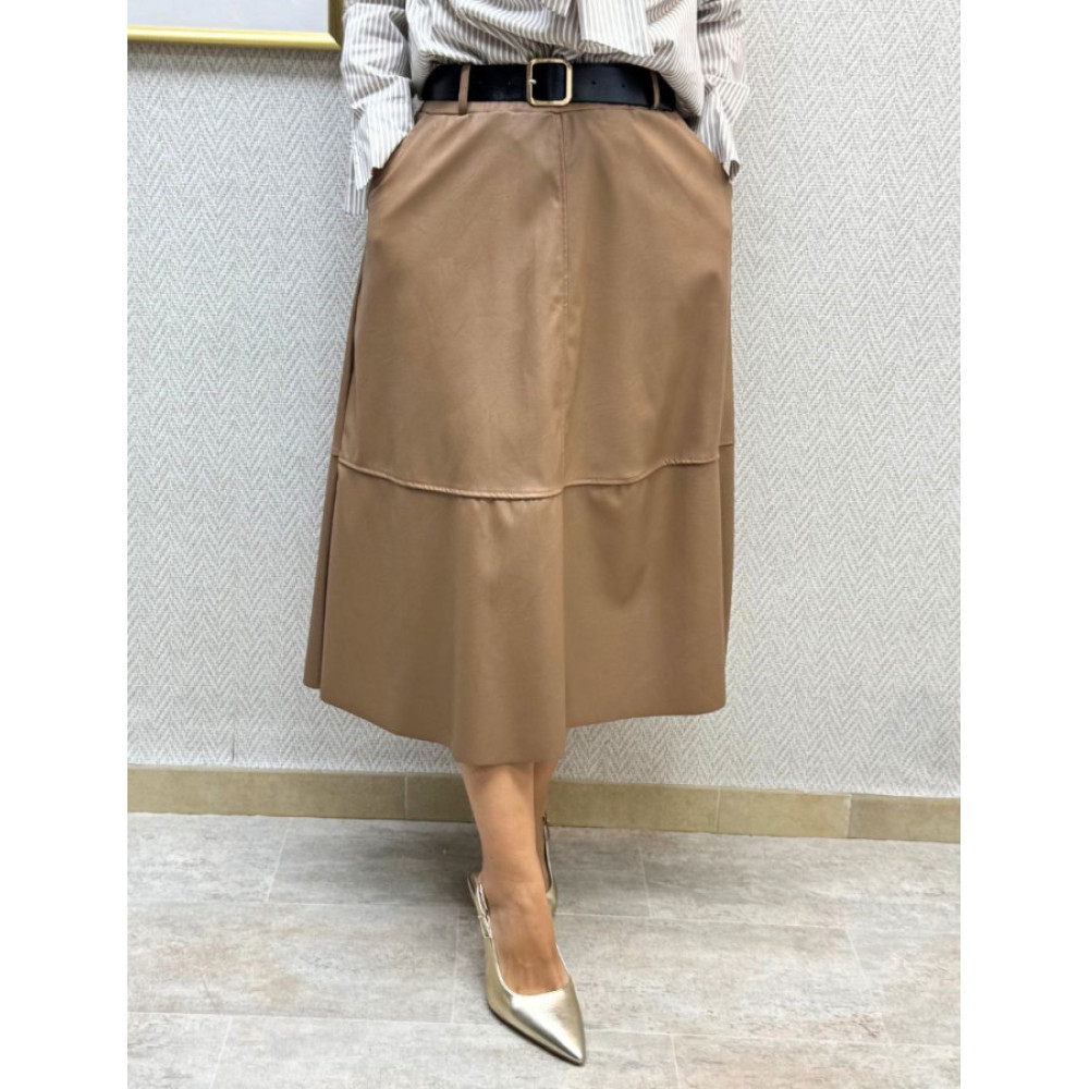 Falda midi de corte acampanado de polipiel. Presenta tiro alto, costuras horizontales que dividen la prenda y un corte limpio en el bajo. Tiene bolsillos laterales. El tejido tiene un acabado liso y con cuerpo.