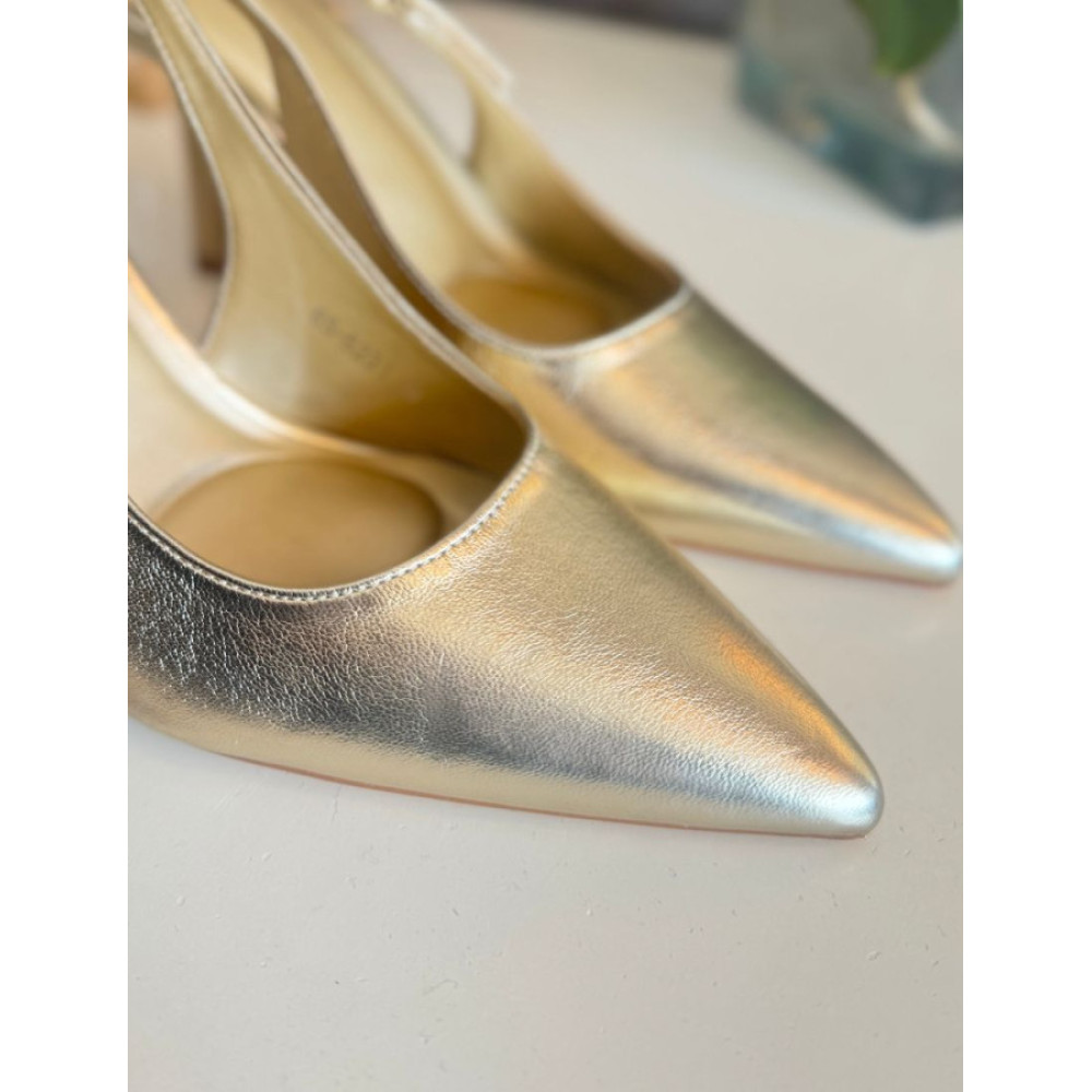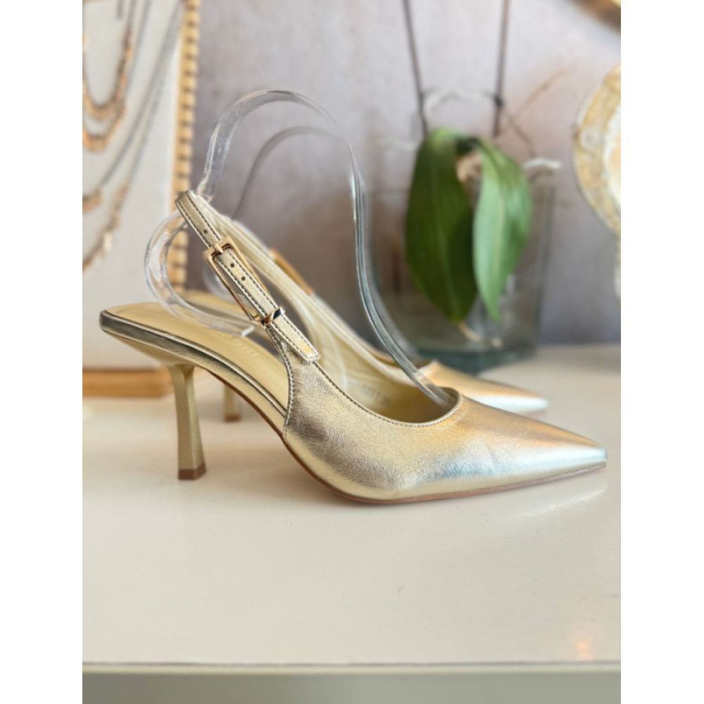 Zapatos de salón con tacón de aguja medio. Presentan un diseño de punta afilada y una tira trasera que sujeta el talón, ajustable mediante una hebilla metálica rectangular. El empeine es de corte bajo y la plantilla es ligeramente acolchada.