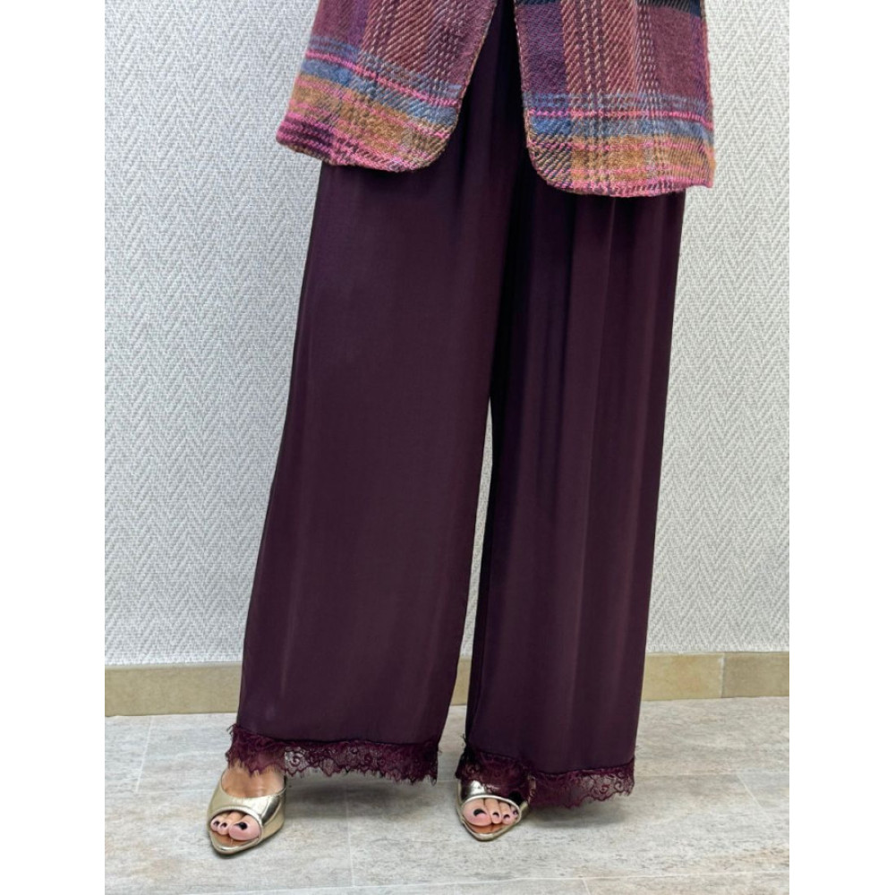Pantalón de corte palazzo con pierna ancha y fluida. Presenta una cintura elástica con fruncido. El bajo de la pierna está rematado con un detalle de encaje festoneado que agrega un contraste de textura al tejido principal.