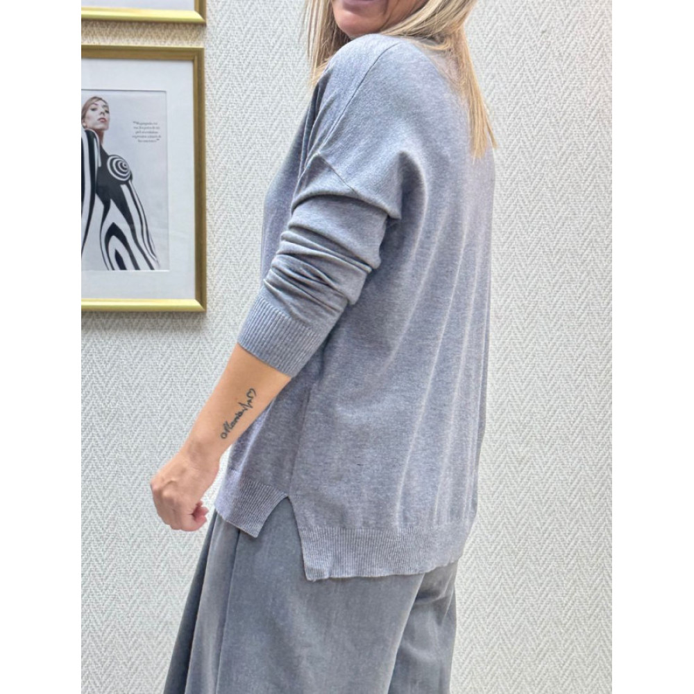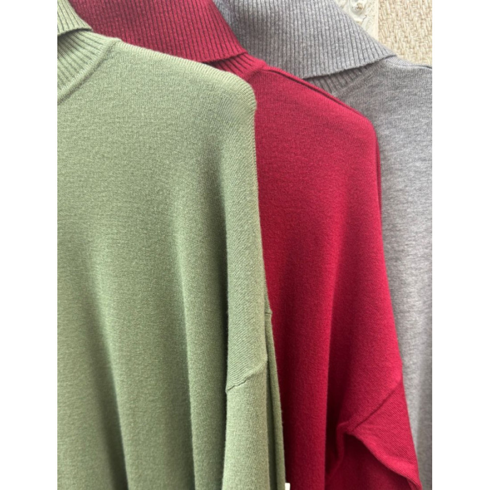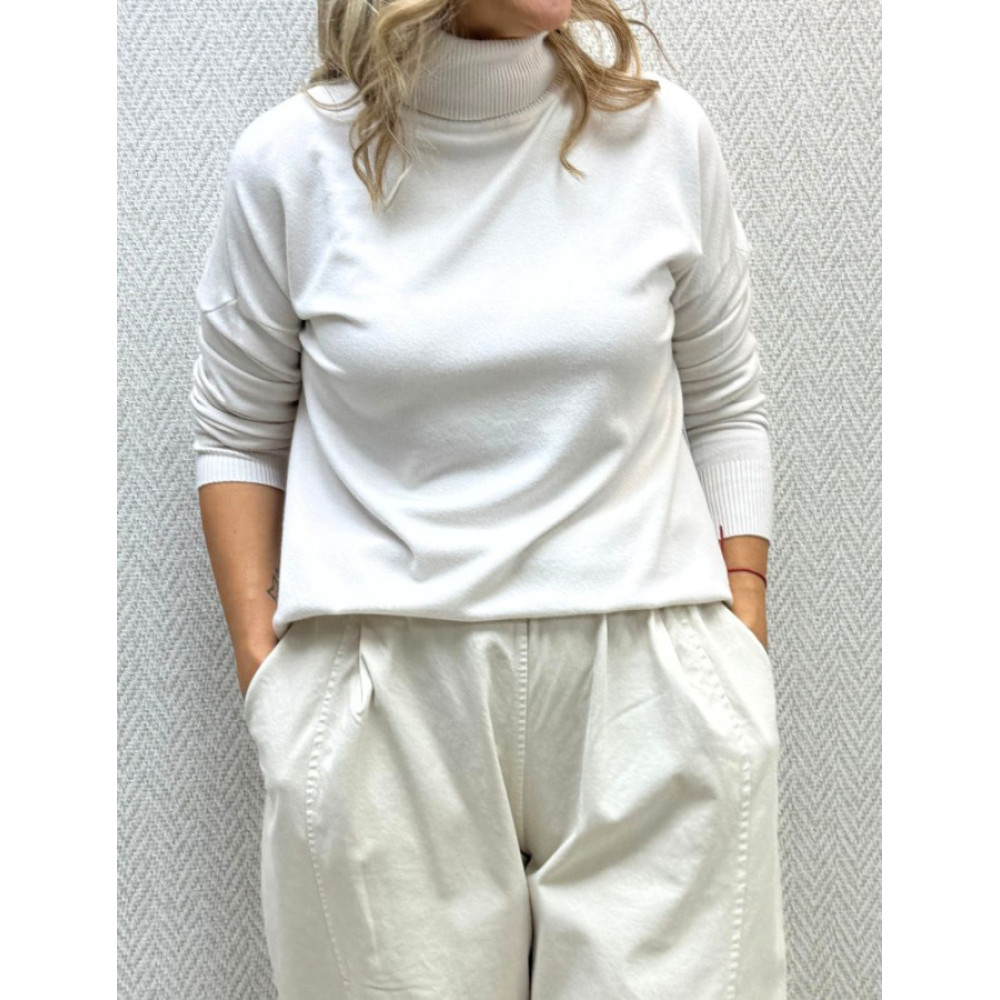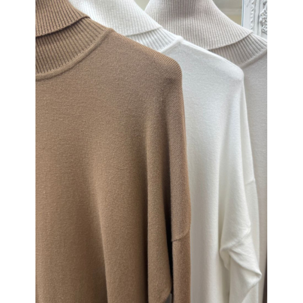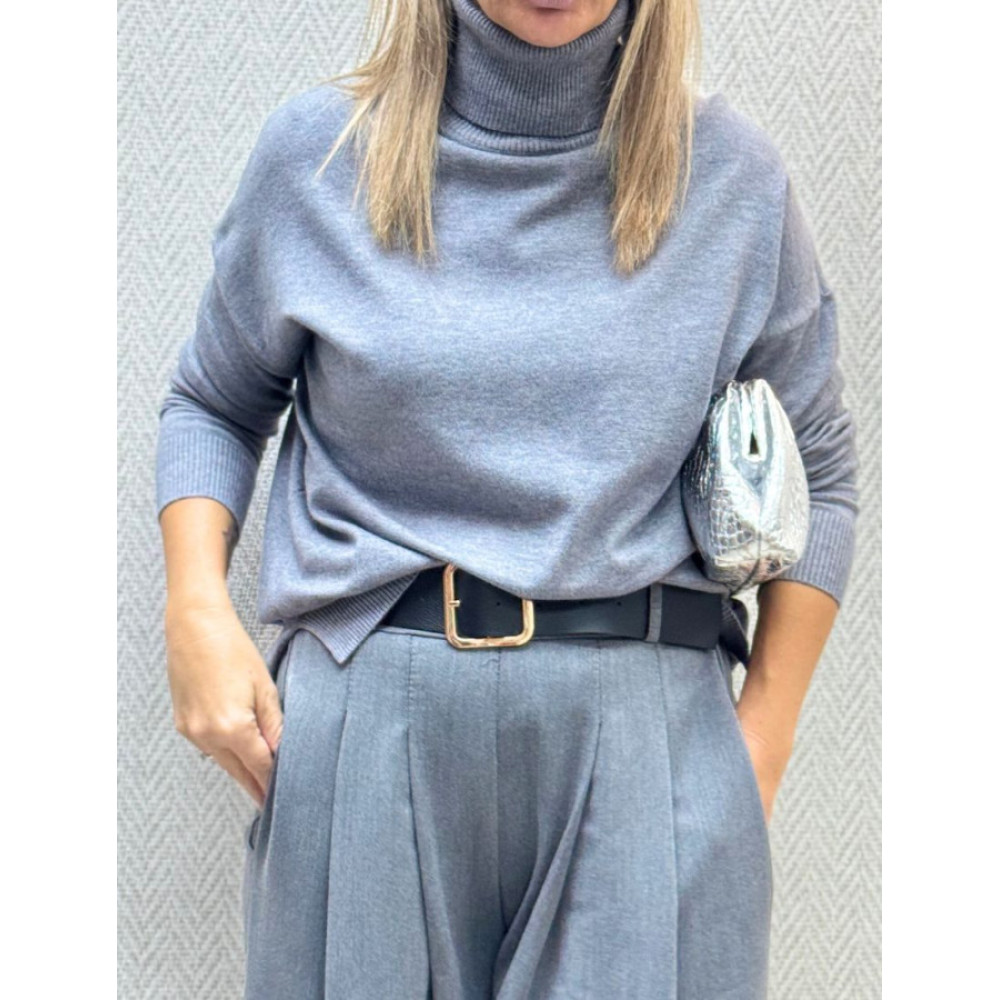 Jersey de punto, con cuello alto o cisne. Presenta un corte de silueta amplia y relajada (oversize), hombros caídos y mangas largas que terminan en puño de punto acanalado. El bajo del jersey es recto.