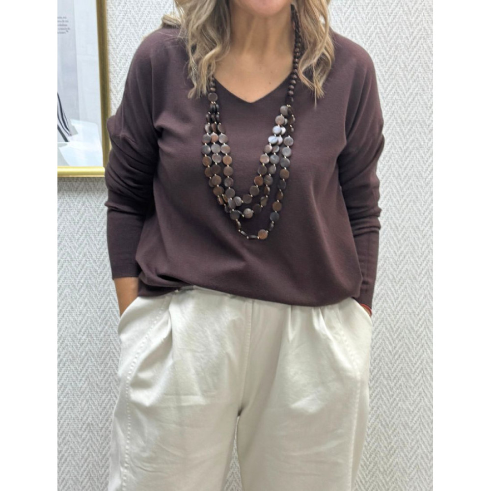 Jersey de punto fino de corte regular y silueta holgada. Presenta un escote en pico y manga larga con hombro caído. El bajo y los puños son rectos, con acabado en punto acanalado estrecho.