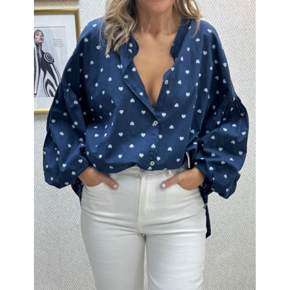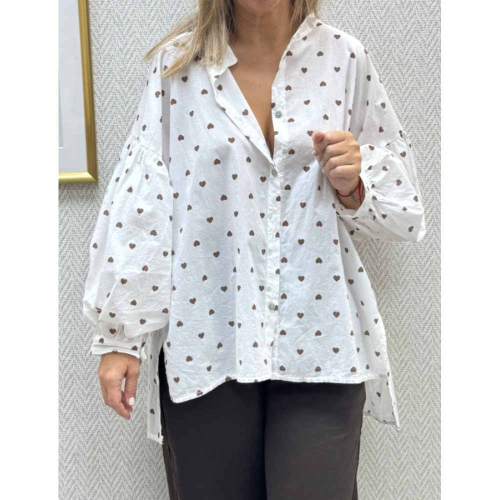 Camisa de tejido ligero con estampado de pequeños corazones, de corte oversize. Presenta cuello mao y escote en pico, con cierre abotonado frontal. Las mangas son largas con volumen, de estilo abullonado, rematadas con puños ajustados. El bajo es de corte asimétrico, más largo en la parte trasera.