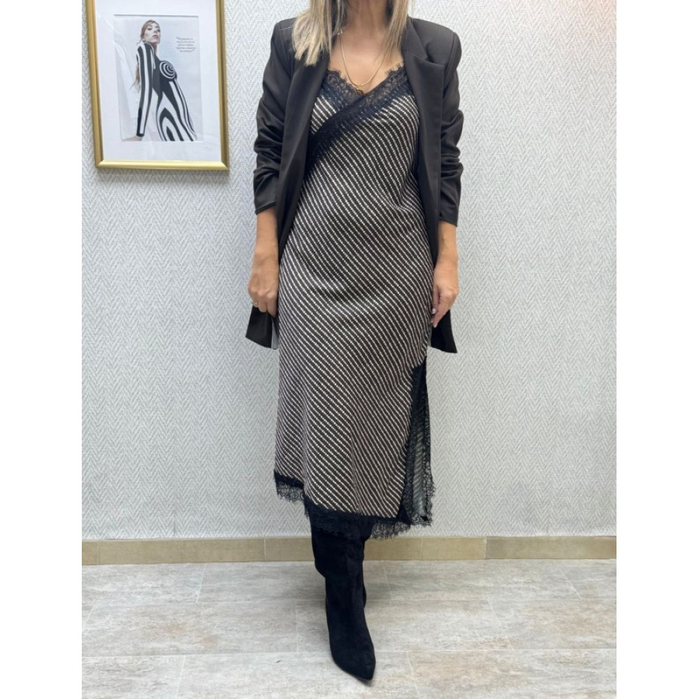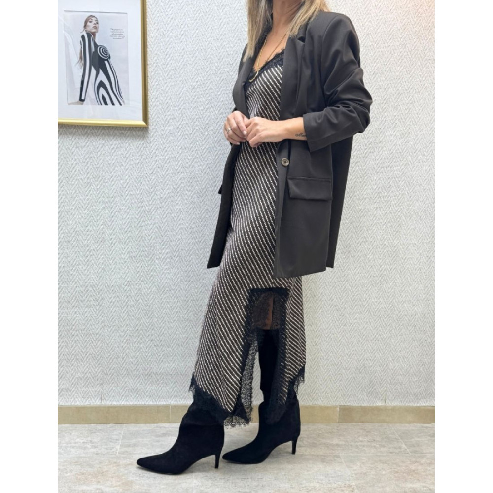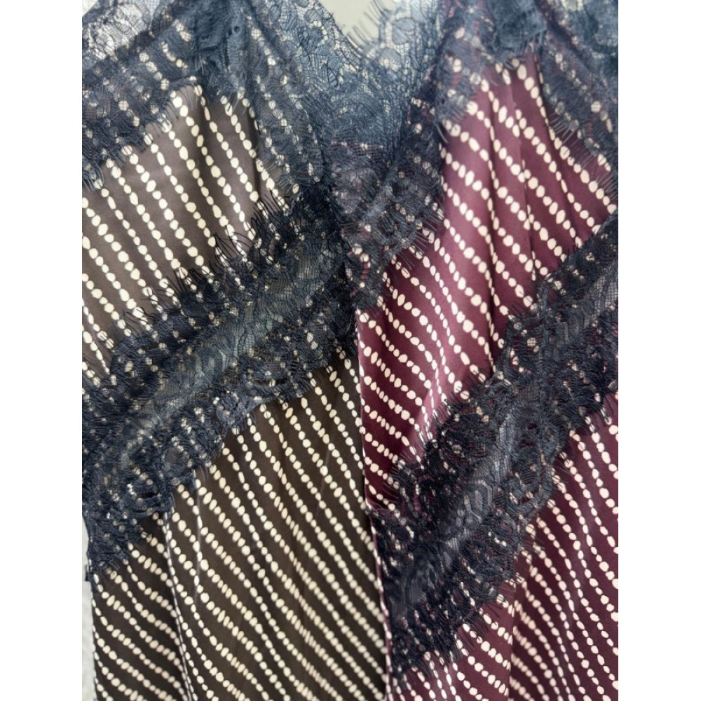 Vestido tipo lencero con estampado de lunares blanco. Presenta escote de pico y detalle de encaje negro en el escote y el bajo. Los tirantes son finos y ajustables. El tejido es de textura ligera y caída.