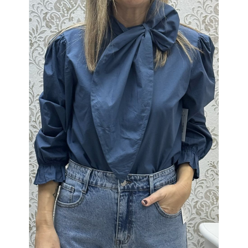 Camisa de manga larga con puño elástico y fruncido. Presenta cierre central frontal abotonado oculto. Caracterizada por un cuello alto y asimétrico con una pieza de tela que se extiende para formar una media lazada en el cuello.