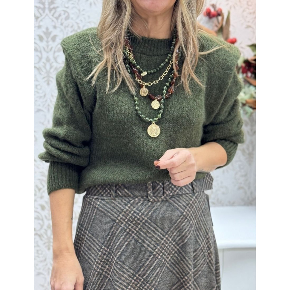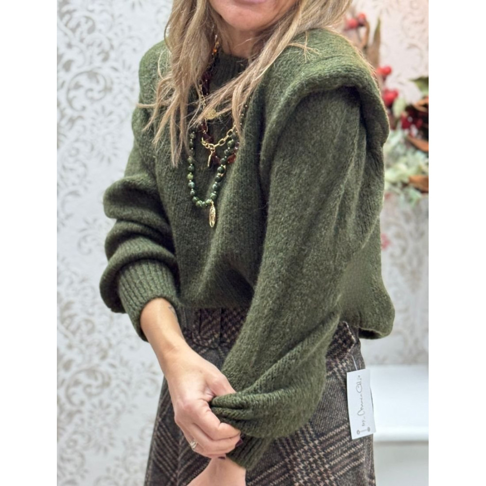 Jersey de silueta holgada. Confeccionado en tejido de punto de lana de apariencia gruesa y peluda. Presenta cuello redondo y manga a tres cuartos, destacando los hombros estructurados con hombreras marcadas.