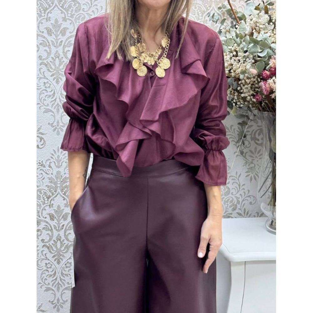 Camisa de corte regular confeccionada en tejido semitransparente. Presenta un cuello de solapa clásico y cierre central abotonado. El diseño se caracteriza por un amplio volante doble que enmarca el cuello y el pecho. Incluye manga larga con un fruncido en el puño que incorpora un elástico.
