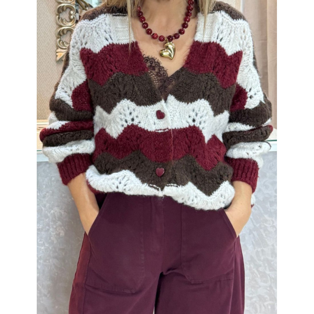 Cárdigan de punto, confeccionado en un punto grueso y con patrón de ondas en tejido que alterna puntos cerrados con puntos calados. Presenta un escote en pico y cierre frontal con botones decorativos de forma de corazón. Las mangas son amplias y largas, terminando en puños ajustados de punto acanalado. El bajo también tiene un remate acanalado y ceñido.