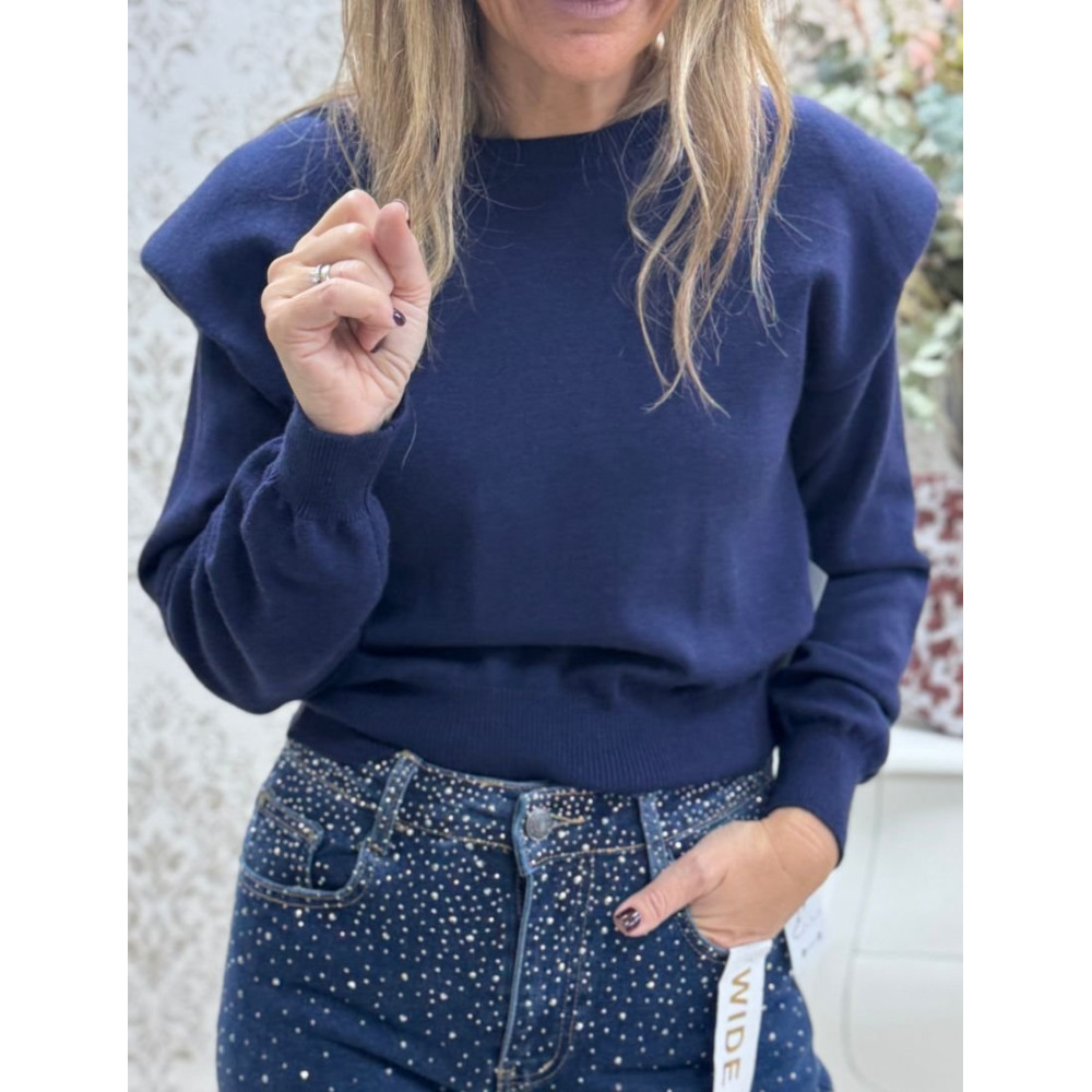 Jersey de punto con diseño de cuello redondo acanalado. Presenta hombros estructurados mediante hombreras. La prenda dispone de mangas largas rematadas en puños de punto elástico y un bajo con el mismo acabado acanalado para favorecer el ajuste.