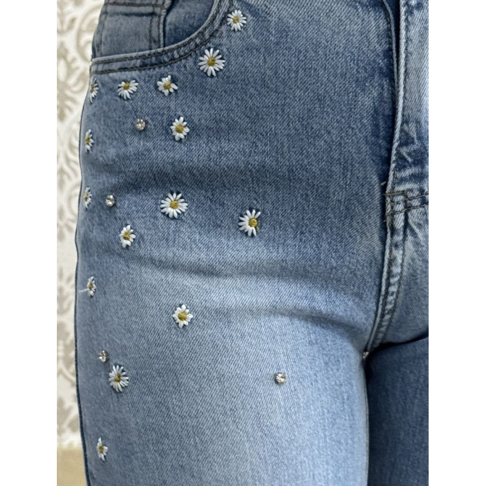Pantalón vaquero de corte recto y pernera ancha confeccionado en denim azul claro con efecto lavado. Destaca por su ornamentación frontal compuesta por una combinación de mini margaritas bordadas y cristales brillantes incrustados de forma dispersa. Presenta un diseño clásico de cinco bolsillos, tiro alto con cierre de cremallera y botón metálico, y un bajo con acabado sencillo de costura a tono.