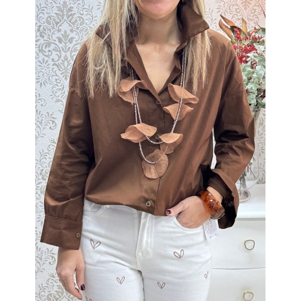 Camisa de corte oversize y silueta estructurada de color marrón chocolate. La prenda presenta un cuello camisero de solapas amplias, cierre frontal mediante botonadura a tono y mangas largas de hombro caído terminadas en puños anchos de cierre sencillo.