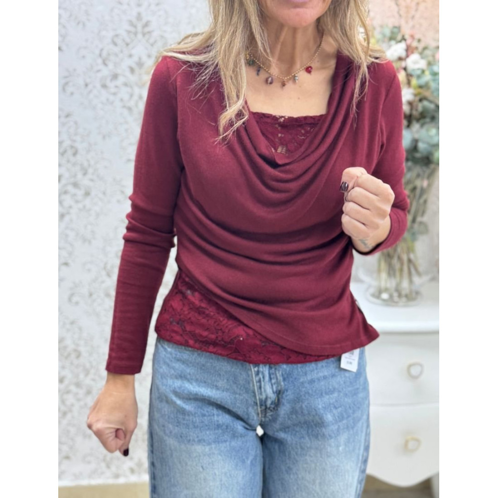 Jersey de punto fino con caída fluida y silueta entallada. La prenda presenta un cuello desbocado de efecto drapeado que genera pliegues naturales en el delantero, integrando una base de encaje floral que asoma tanto en el escote como en el bajo.
