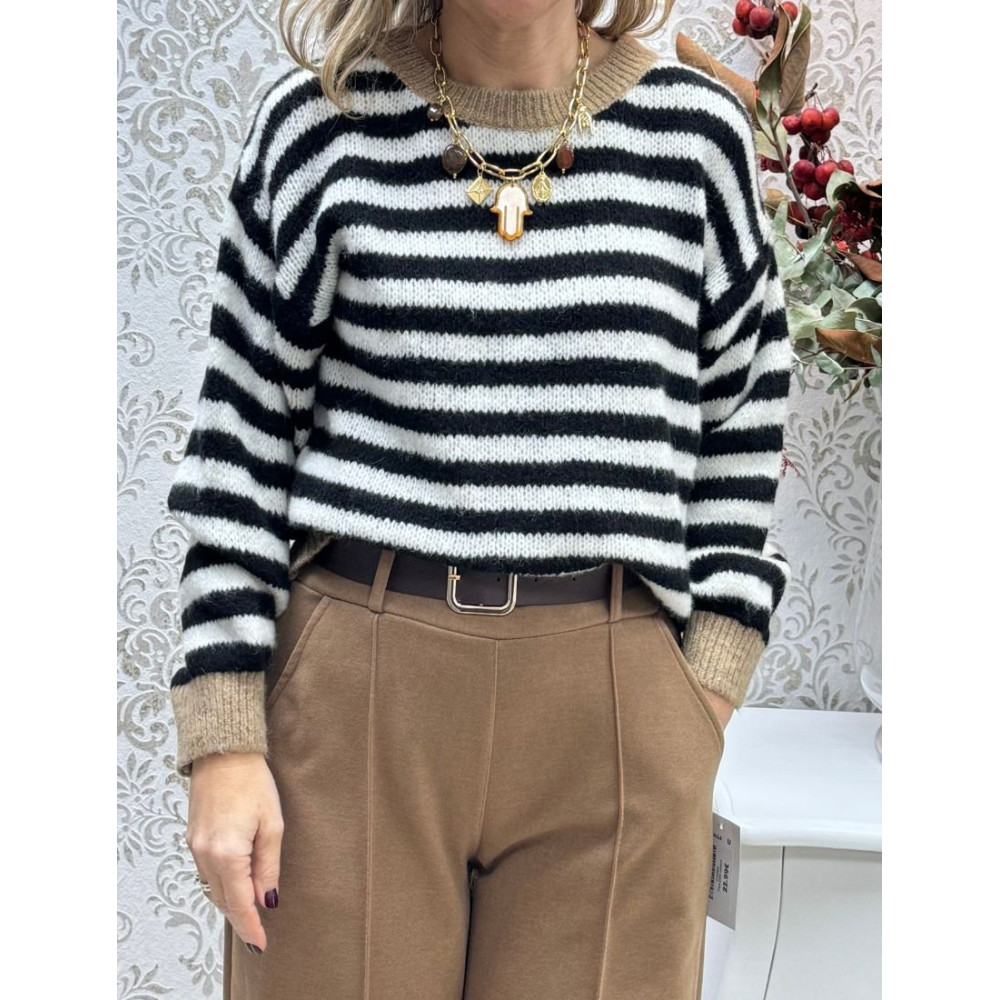 Jersey de punto de grosor medio con acabado texturizado y diseño de rayas horizontales. Presenta un corte de manga larga con hombros caídos y remates de canalé elástico en contraste, tanto en los puños como en el cuello redondo. El tejido es ligeramente esponjoso y un ajuste holgado que se adapta a la silueta.